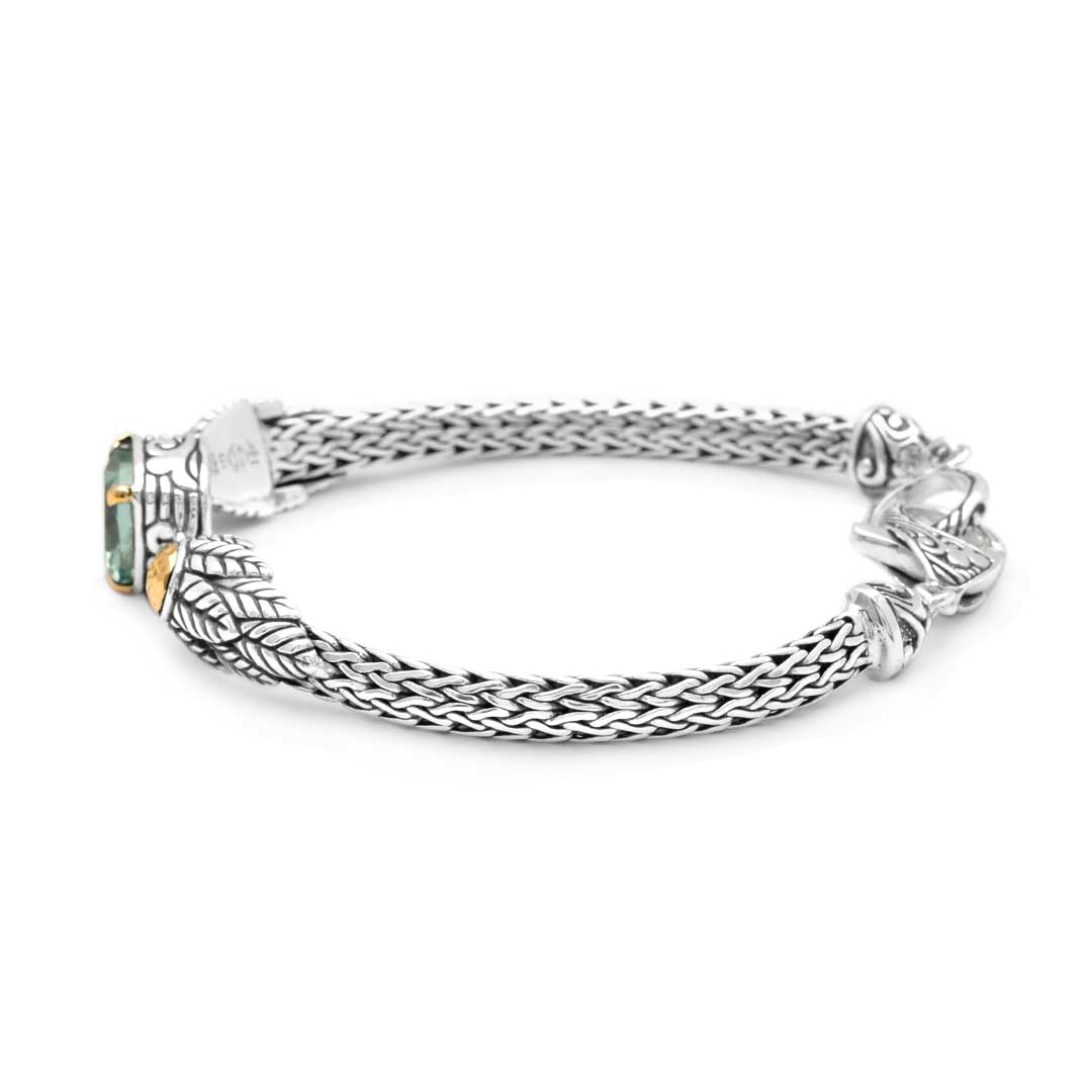 Gold & Silver bracelet, Green Amethyst cushion 10 mm, 18K gold accents. Chain 3x5 oval
