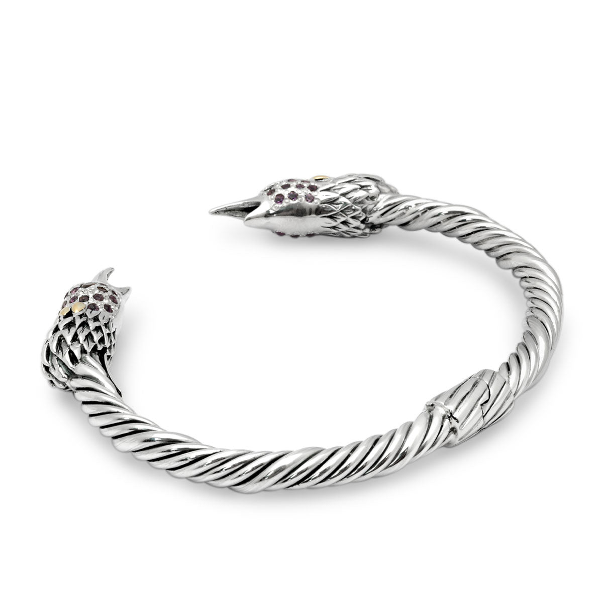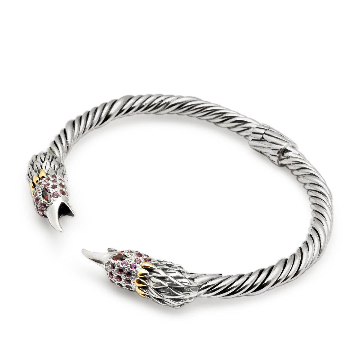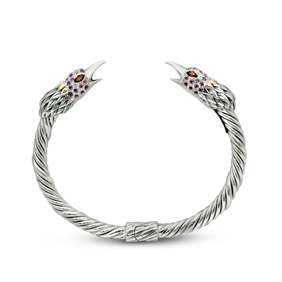 Gold & Silver cable bangle, bird head with Garnet Eye's and Amethyst Pave Setting