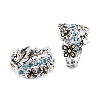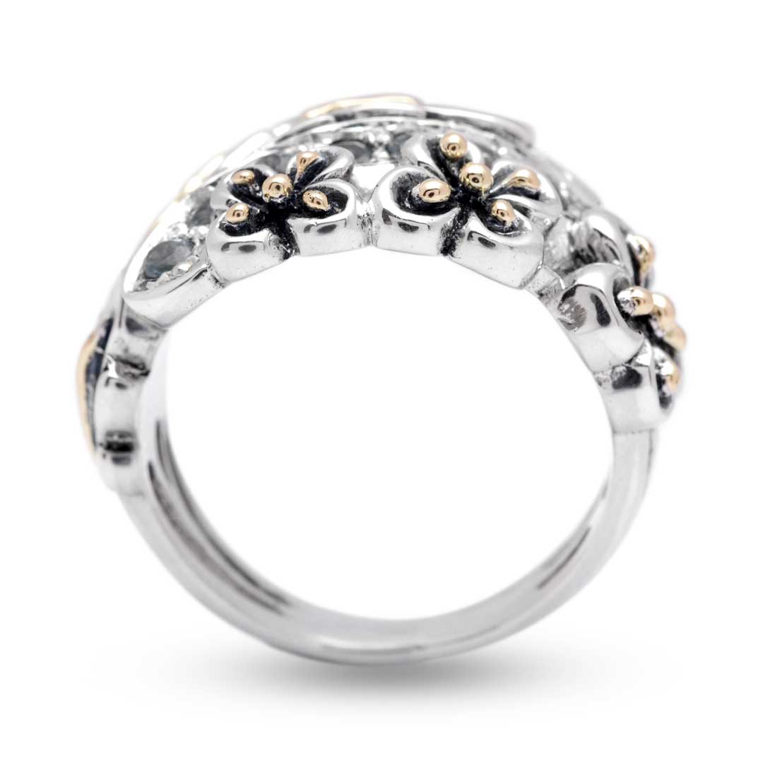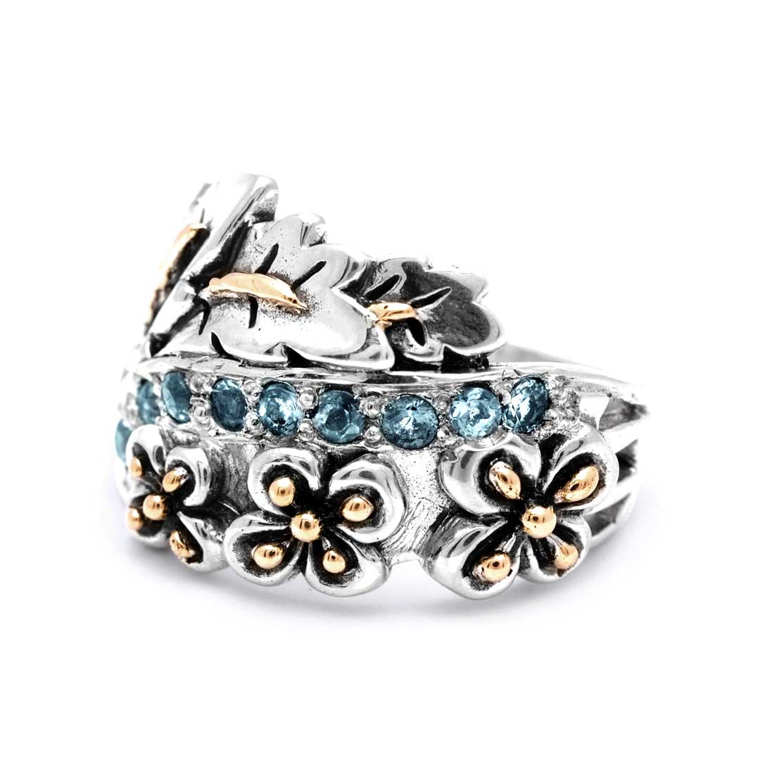 Silver and Gold Ring with Blue Topaz, Balinese Flower Motif