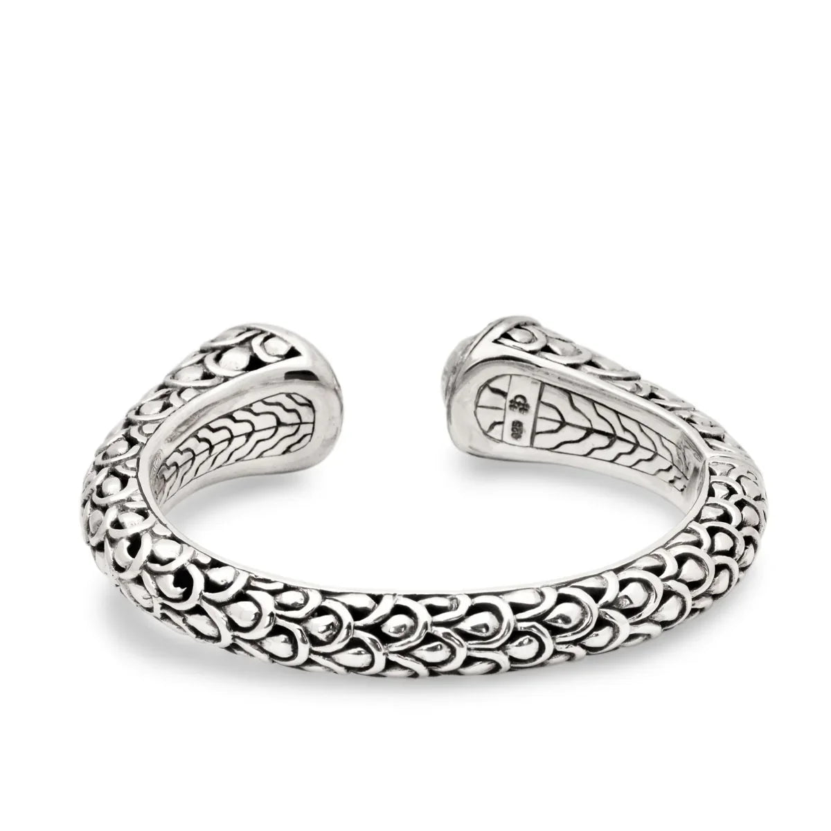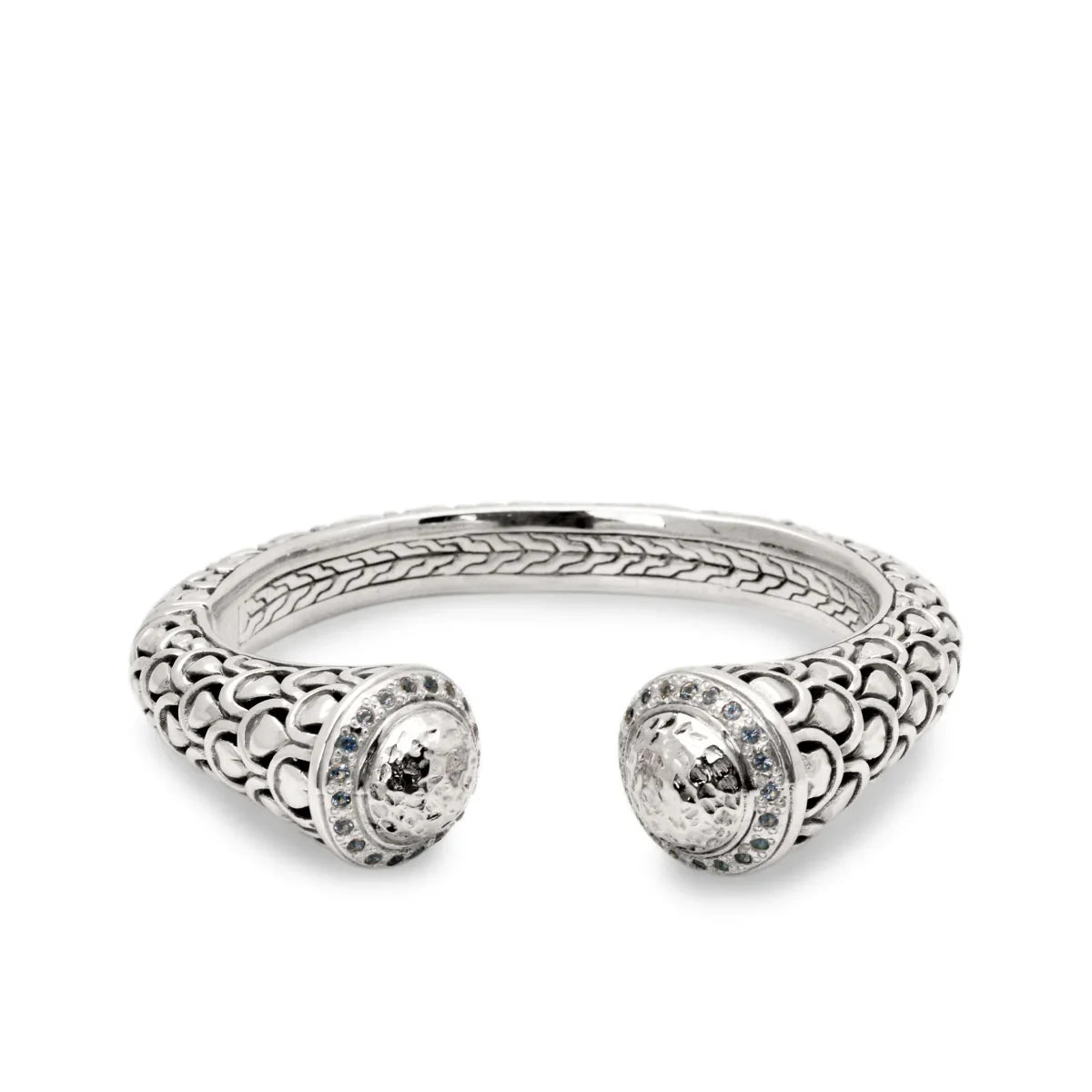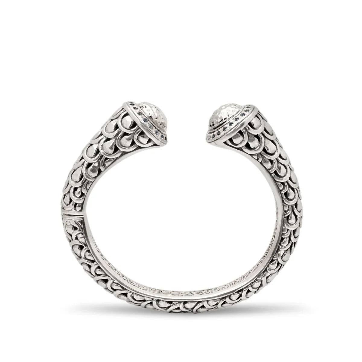 Silver bracelet, kick cuff with scale dragon motif, hammer motif and white topaz pave stones