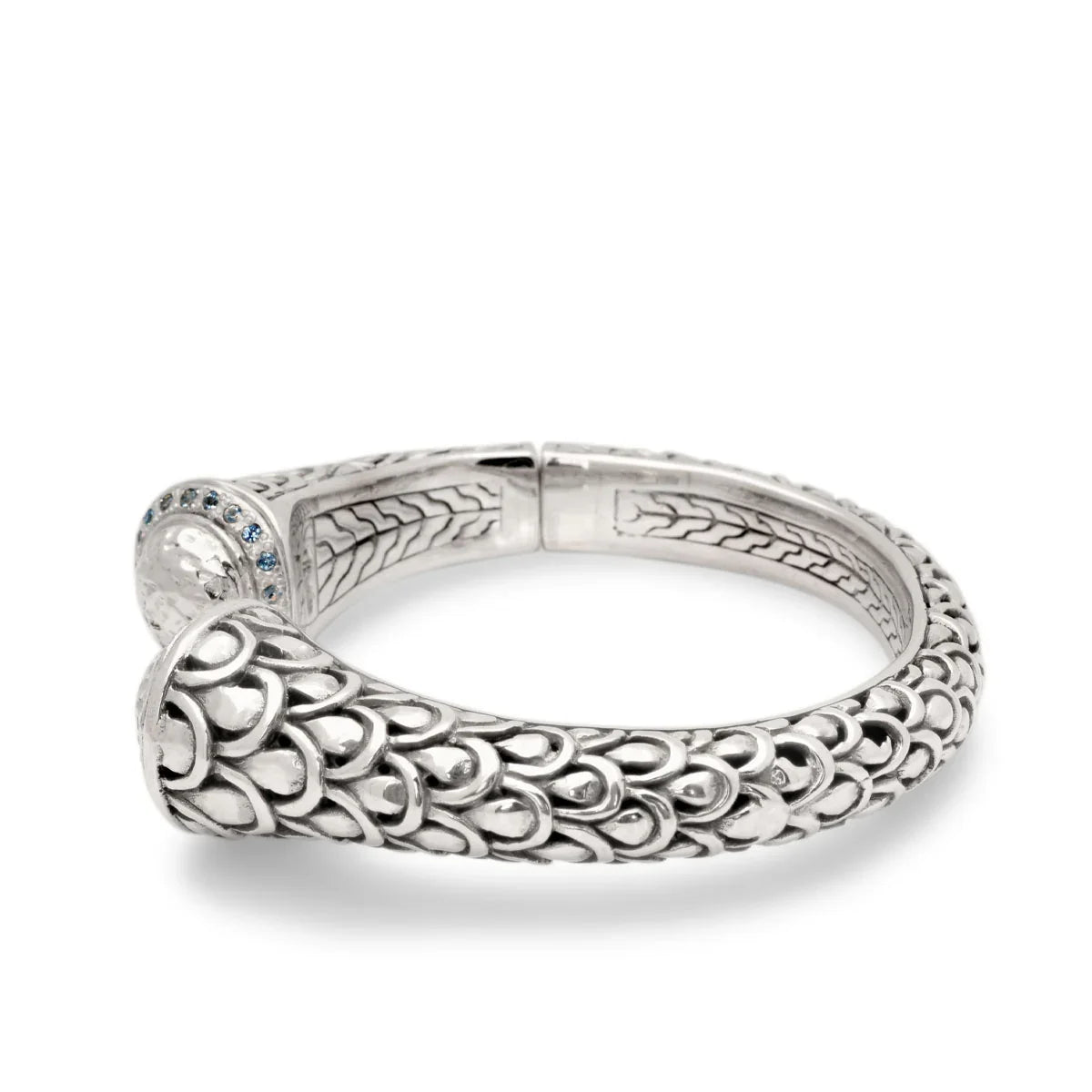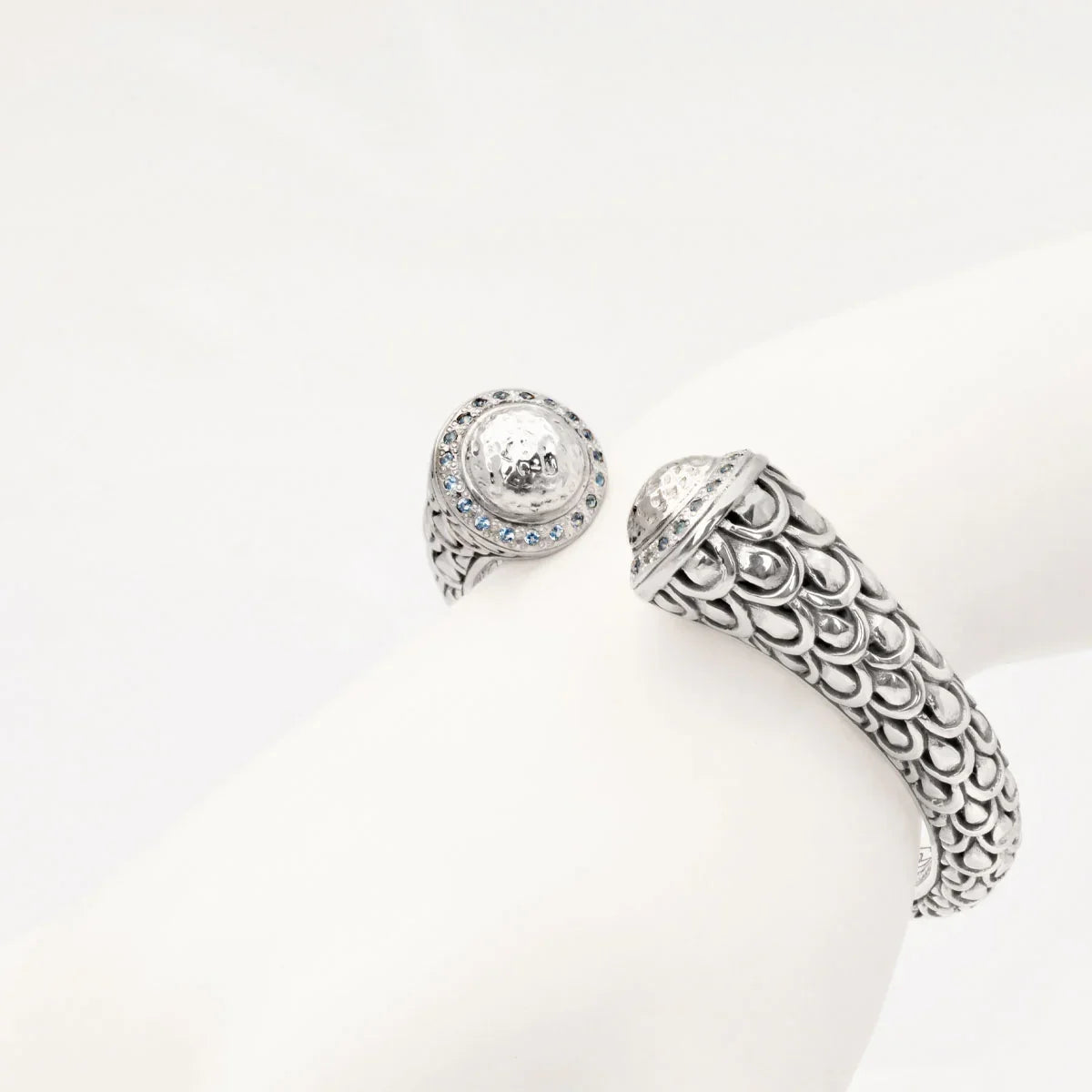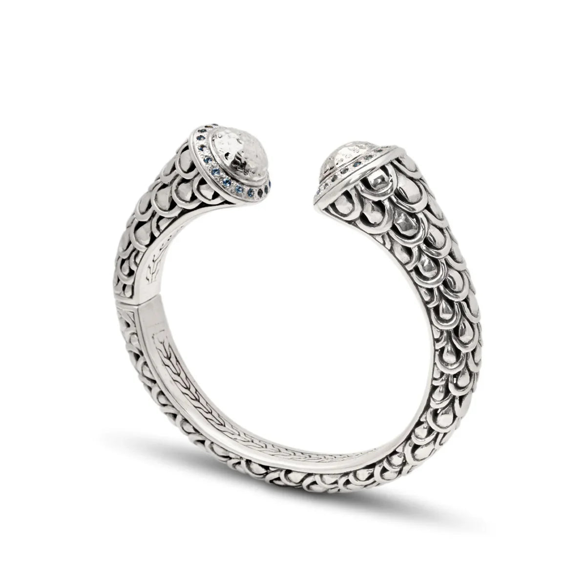 Silver bracelet, kick cuff with scale dragon motif, hammer motif and white topaz pave stones