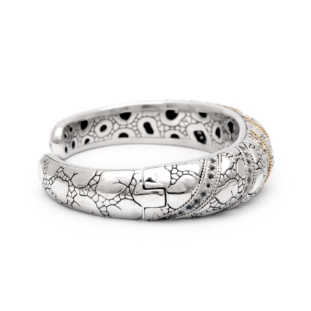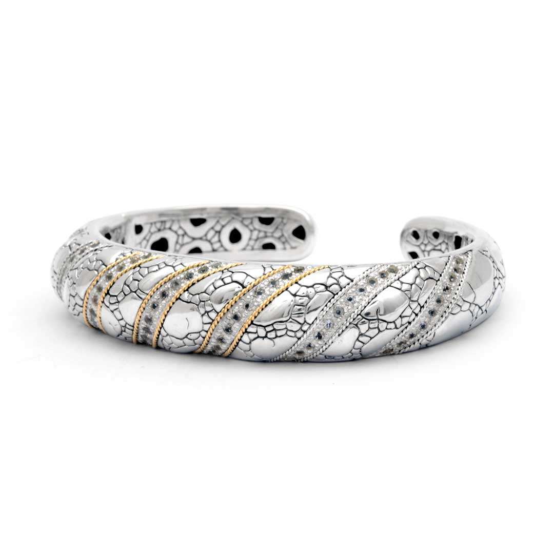 Silver & Gold Bracelet with crocodile skin motif and 3 rows 18K gold rope, kick cuff