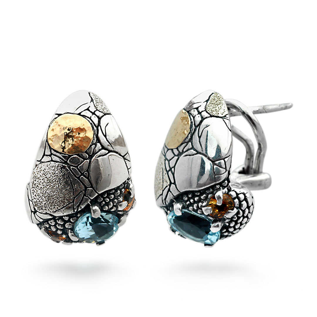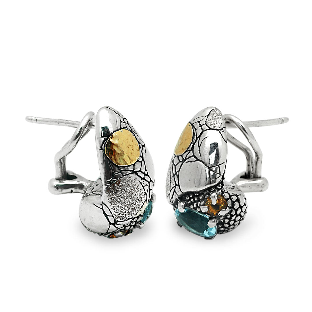 Gold & Silver Earring crocodile motif with Blue Topaz and Citrine. Omega Clasp