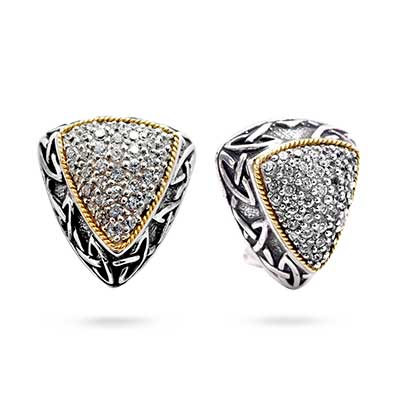 Gold & Silver earring, trillion shape with white topaz pave setting. Gold Rope bezel