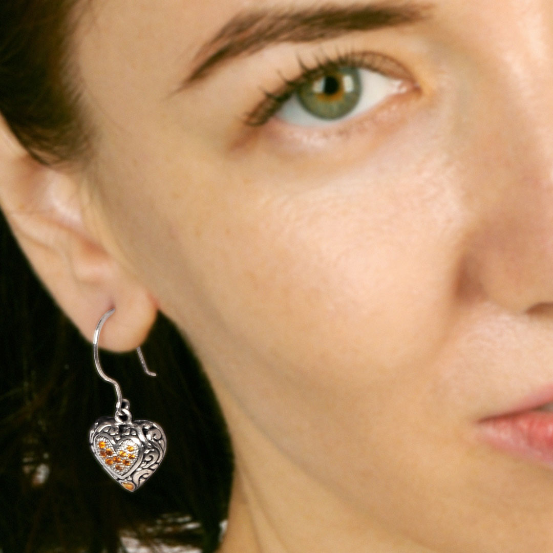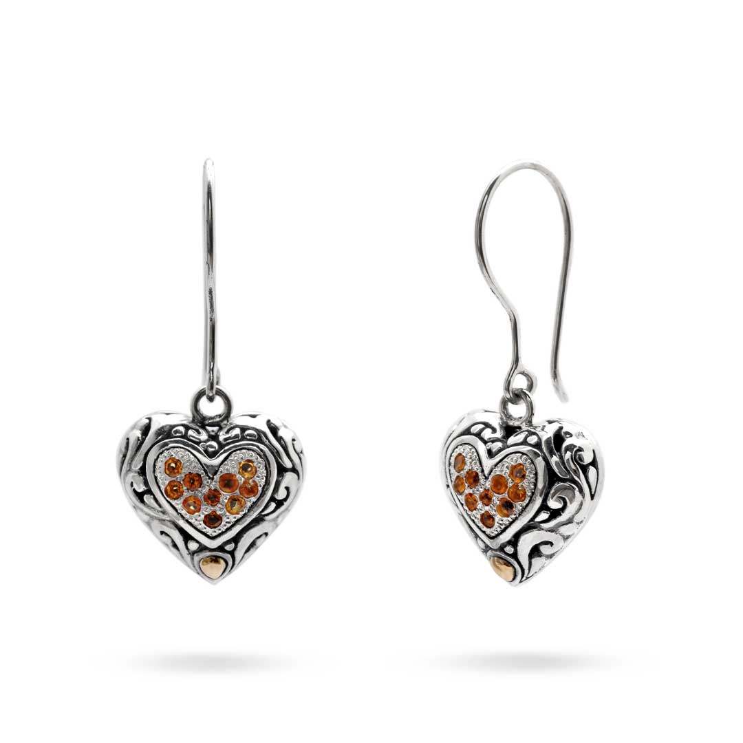 Gold and silver heart earring with citrine pave setting,Bali motif