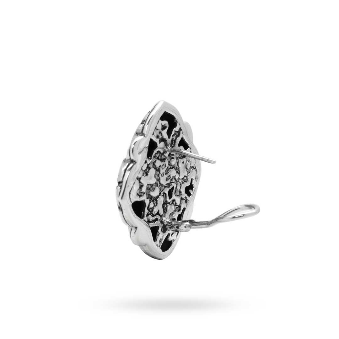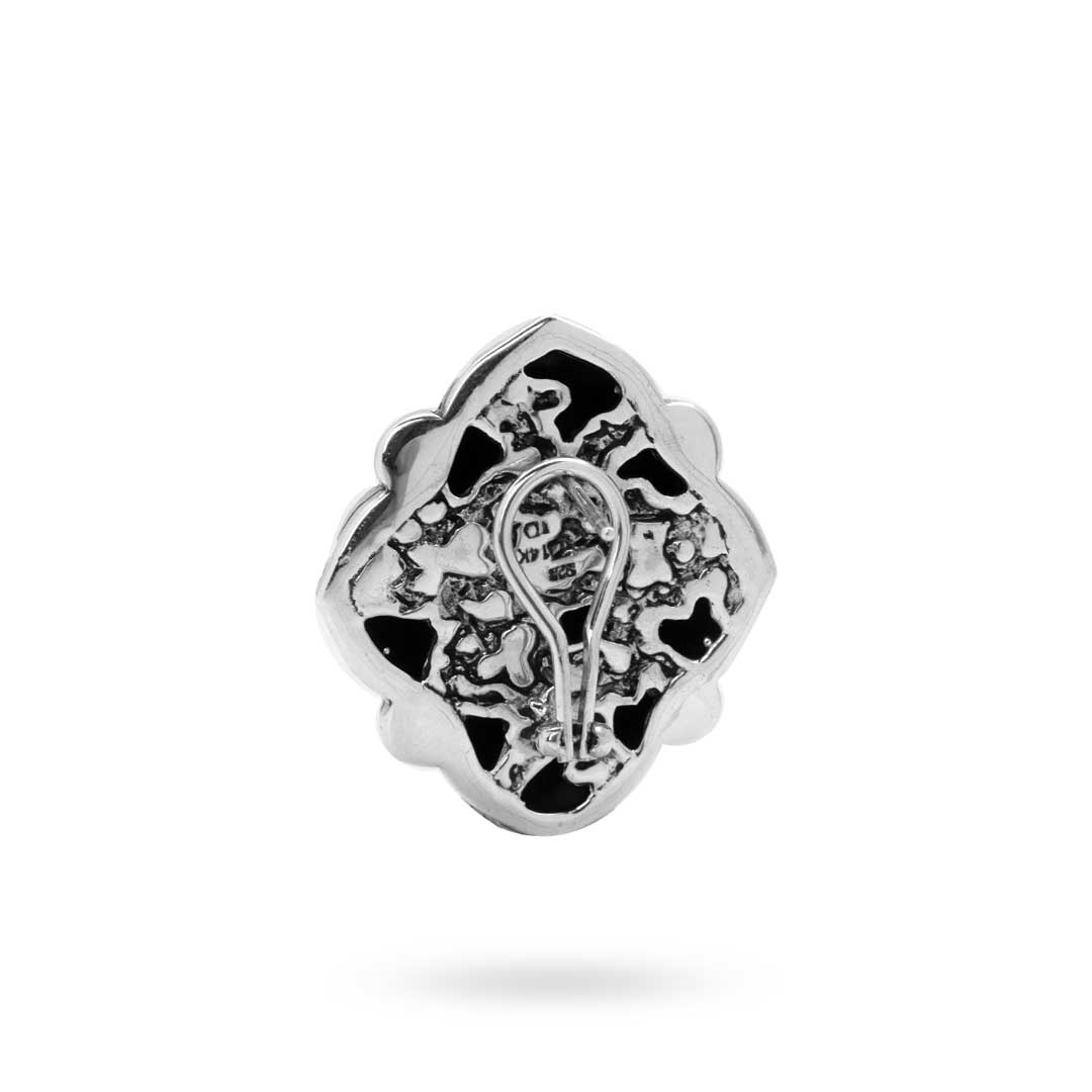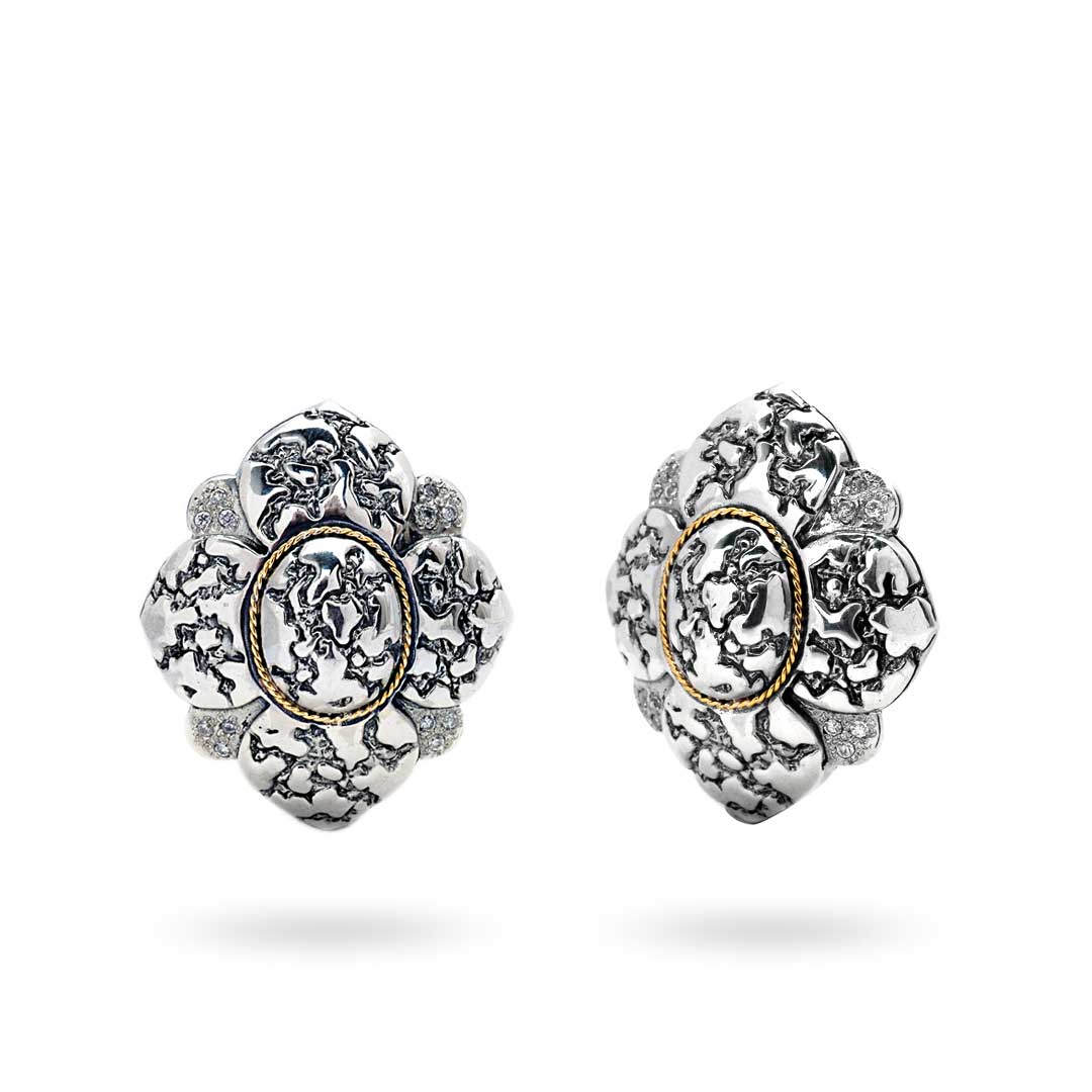 Silver and Gold earring, flower shape, Plaster texture motif, set with white Zircon pave setting