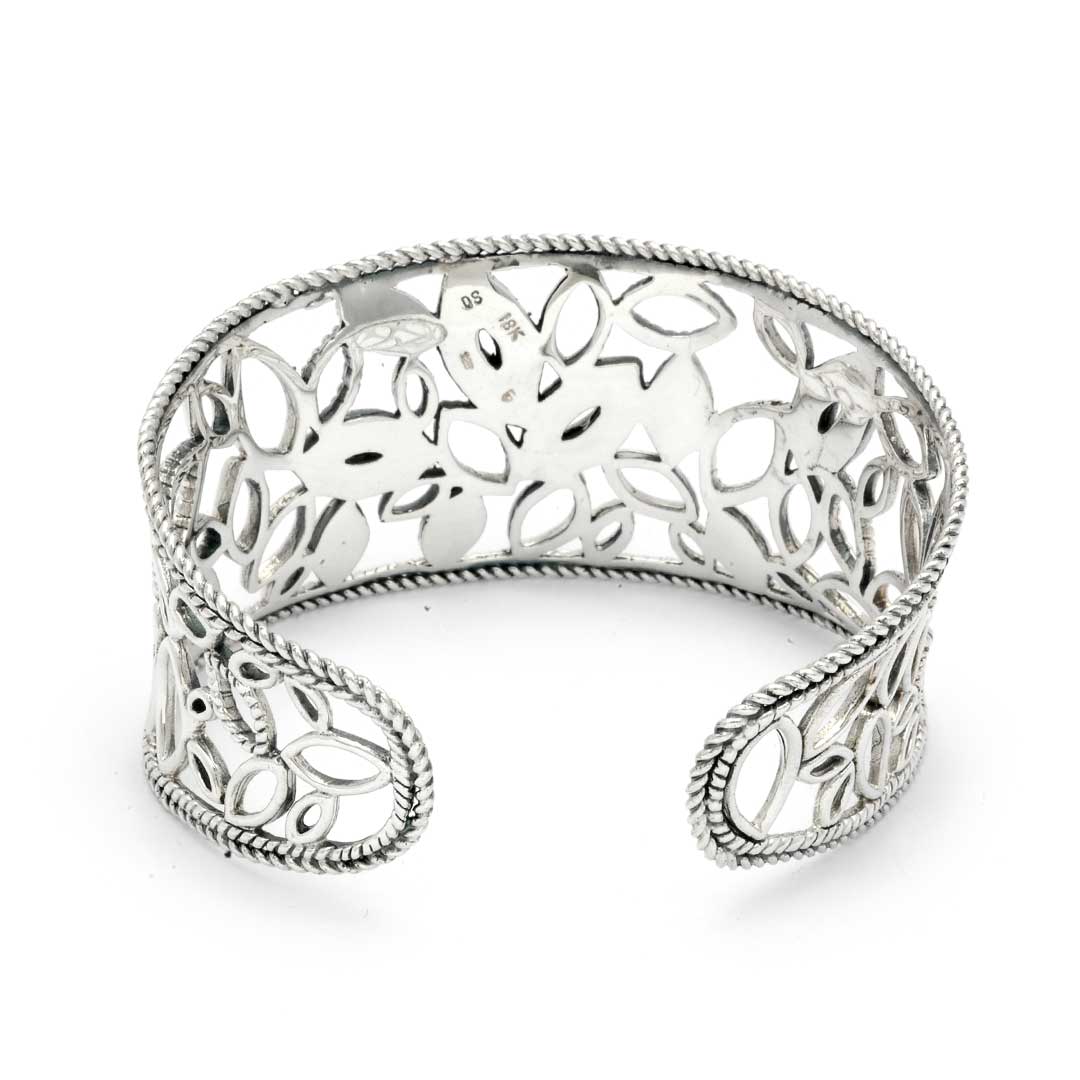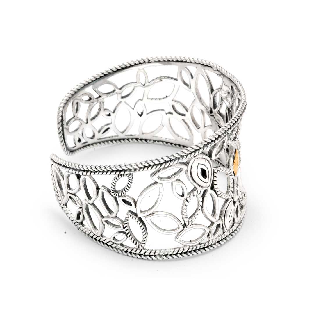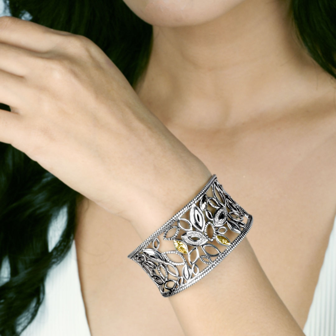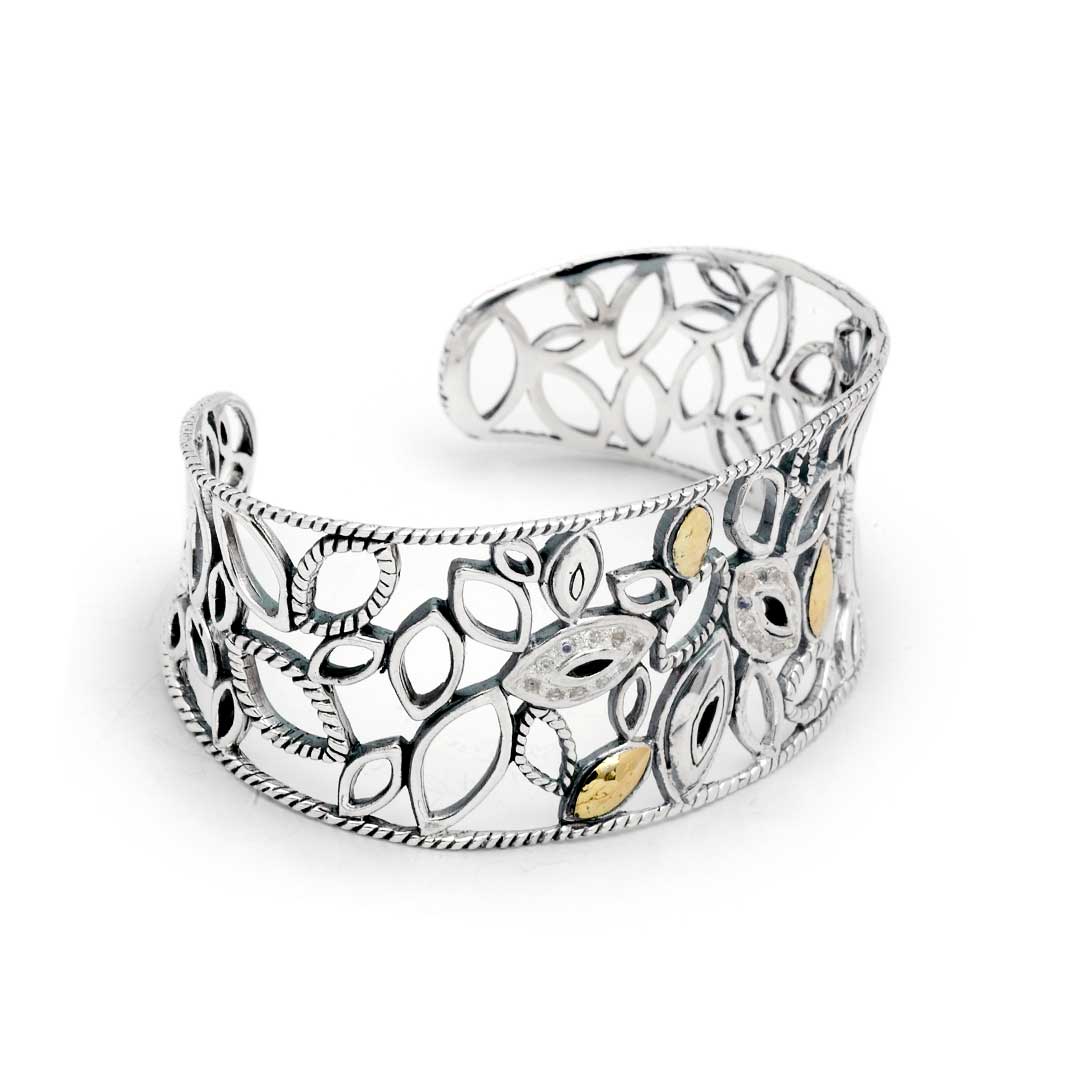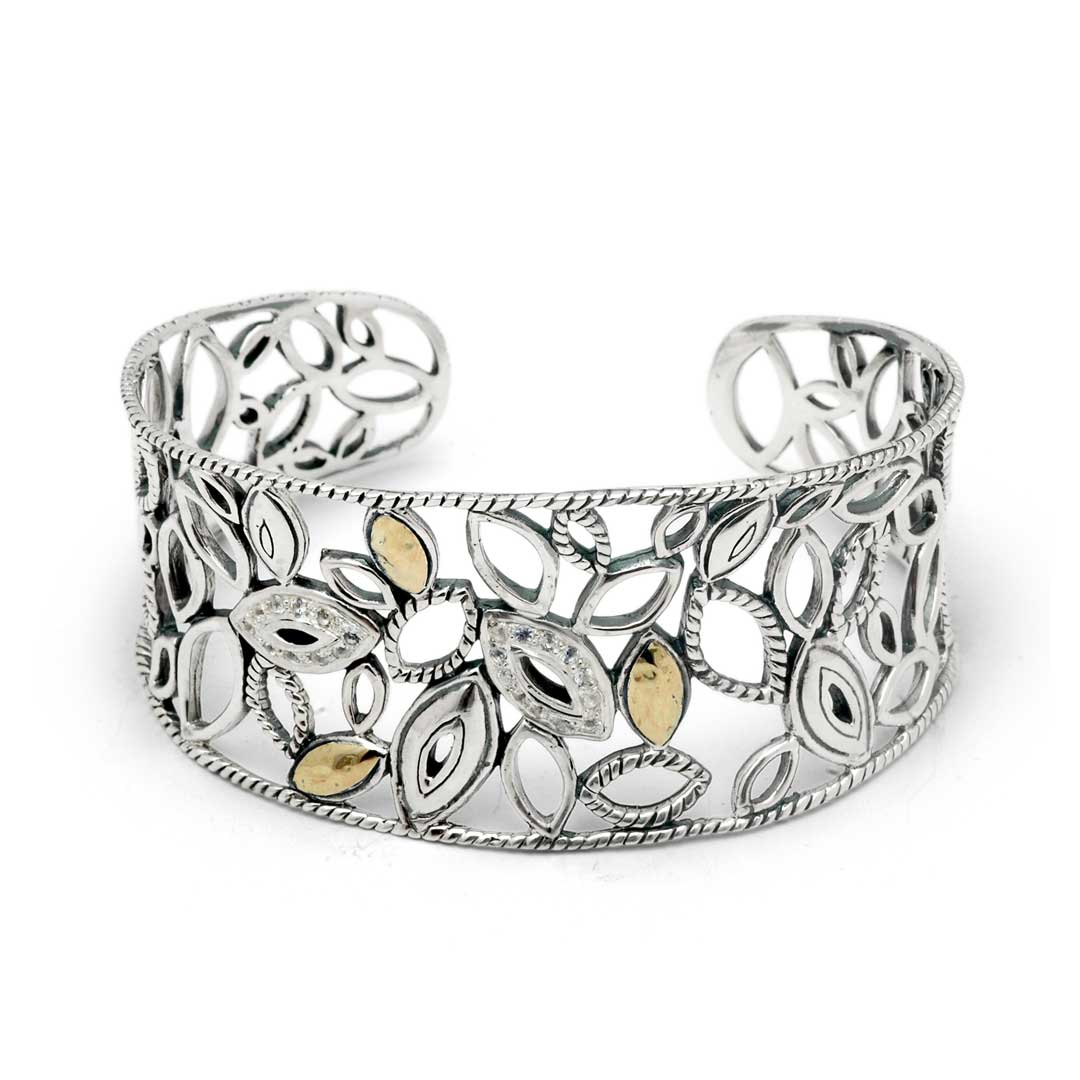 Gold & Silver cuff bracelet, marquise shape motif with water rope, White topaz pave setting