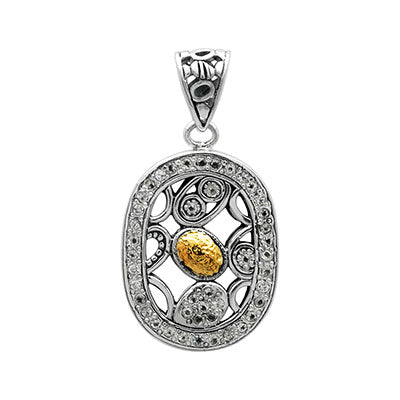 Gold & Silver pendant, oval shape with 18K gold hammer, white topaz pave setting