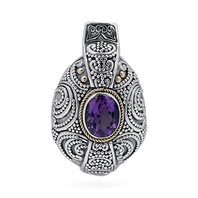 Gold & Silver Pendant, Balinese Jawan Motif Amethyst Quartz