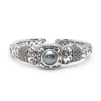 Gold Silver Kick Cuff Bracelet Blue Mabe Balinese Jawan Plaster Motif