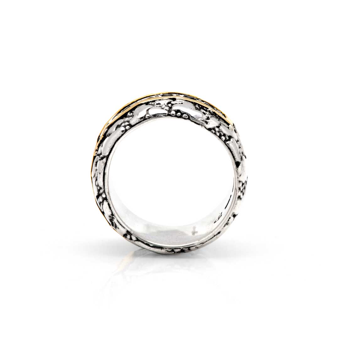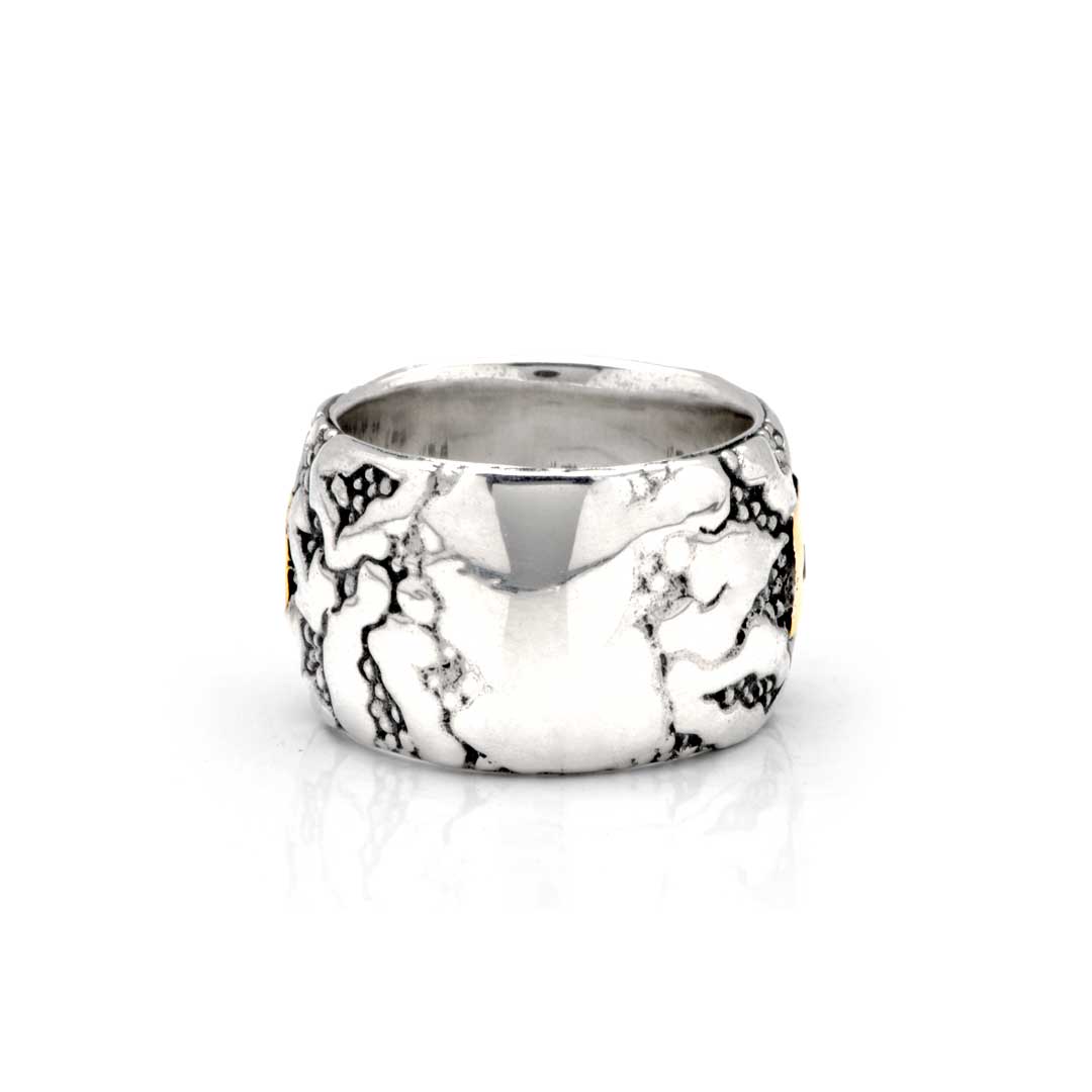 Gold & Silver band ring, 18K gold bezel, plaster motif collection, Onyx Pave