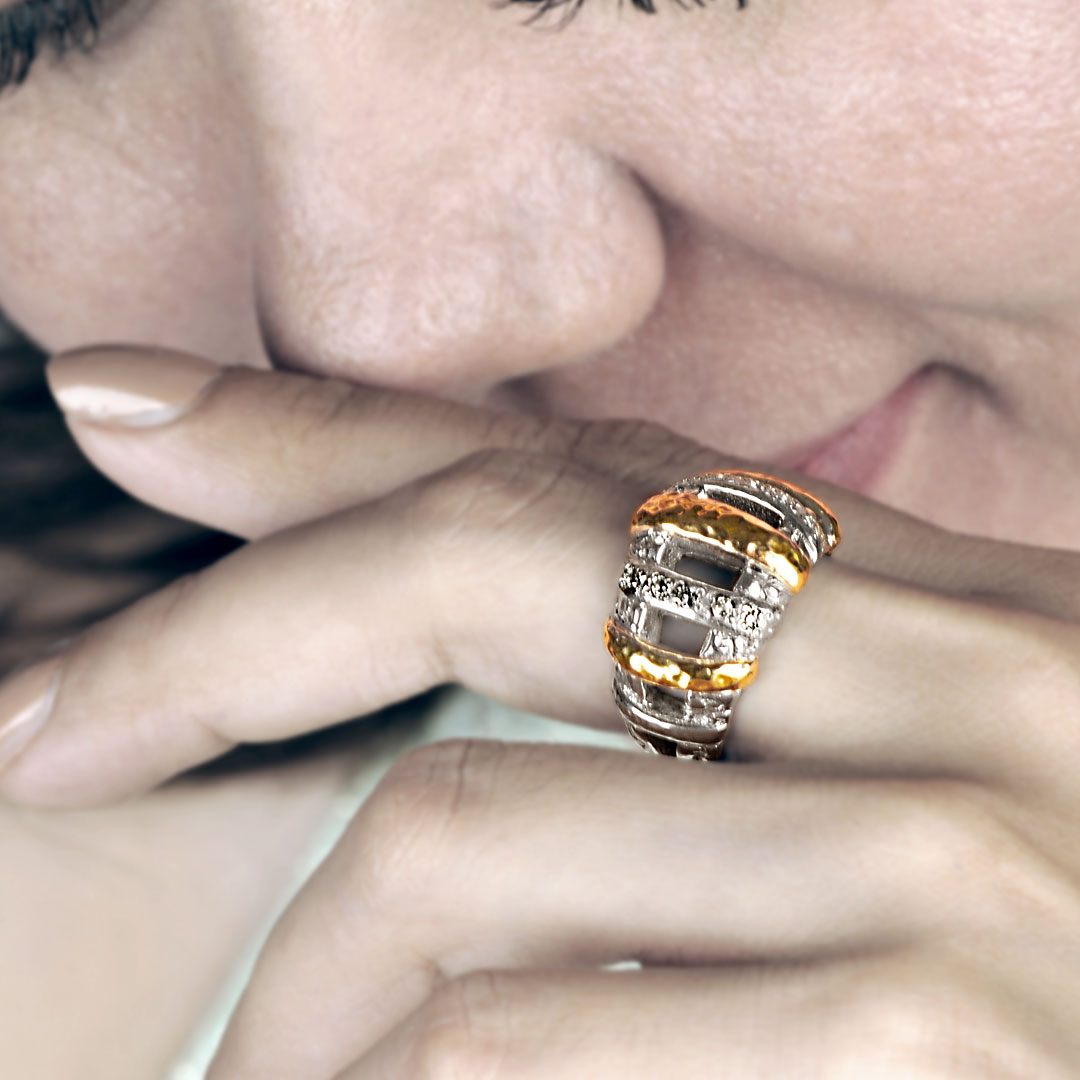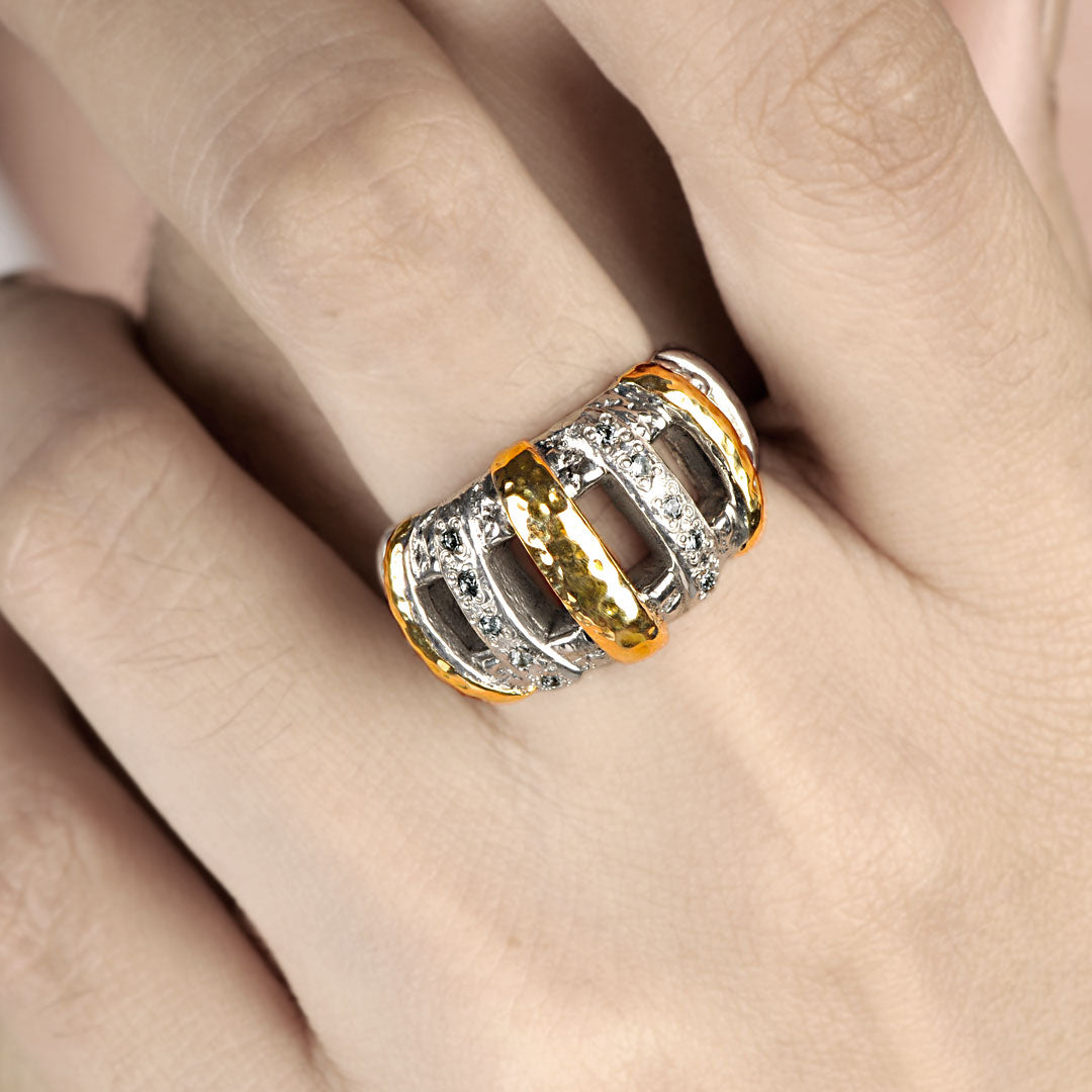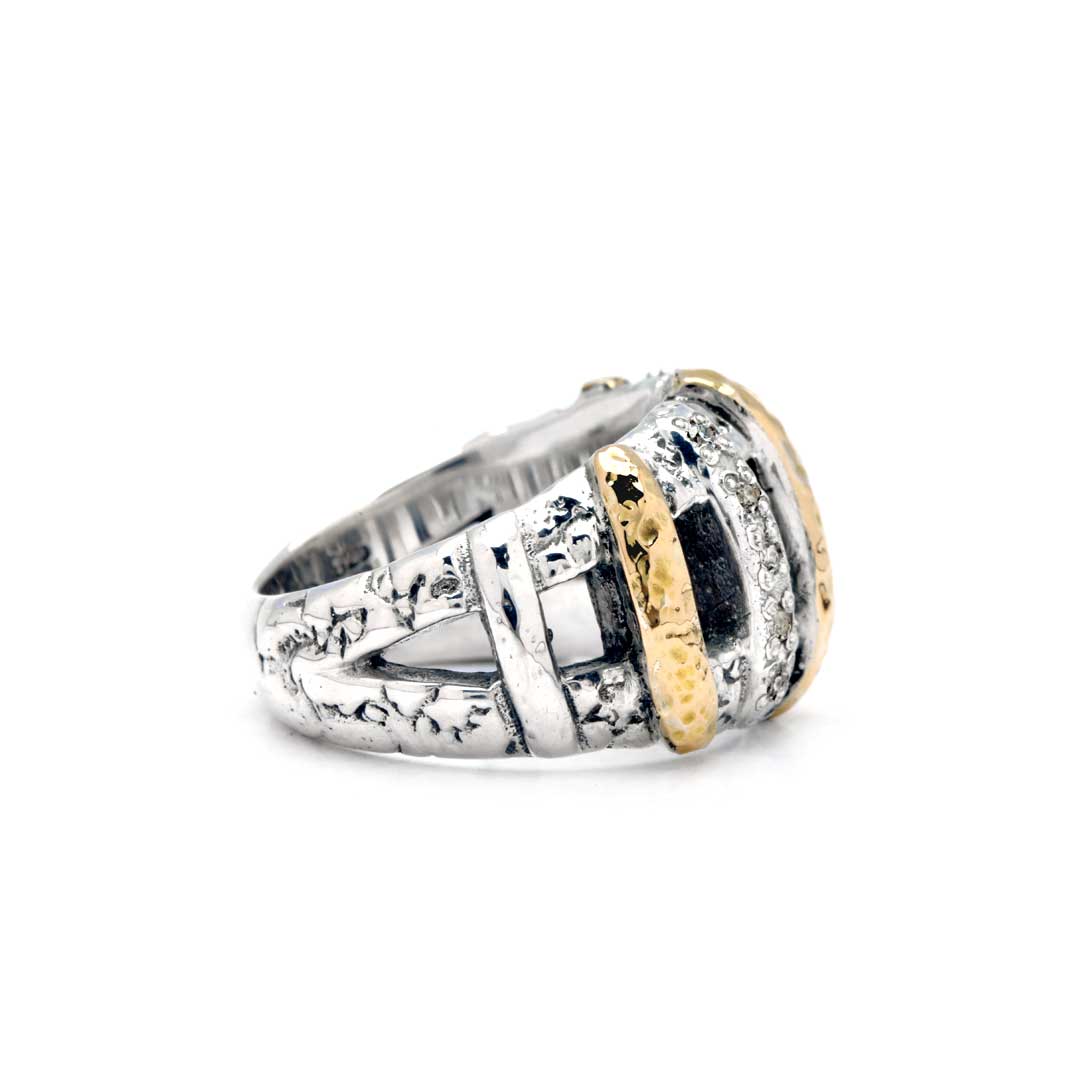 Gold & Silver ring, 18K gold hammer, plaster motif collection, white topaz pave
