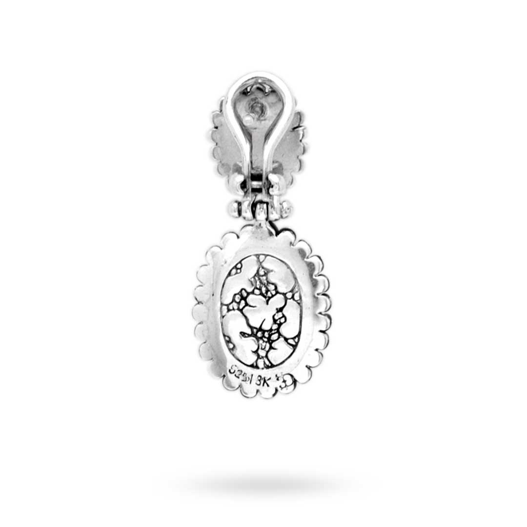 Use the white side of the provided polishing cloth to gently wipe silver portions clean. Remove any remaining tarnish or impurities with mild diluted soap and warm water. Dry thoroughly before storing in its jewelry pouch.