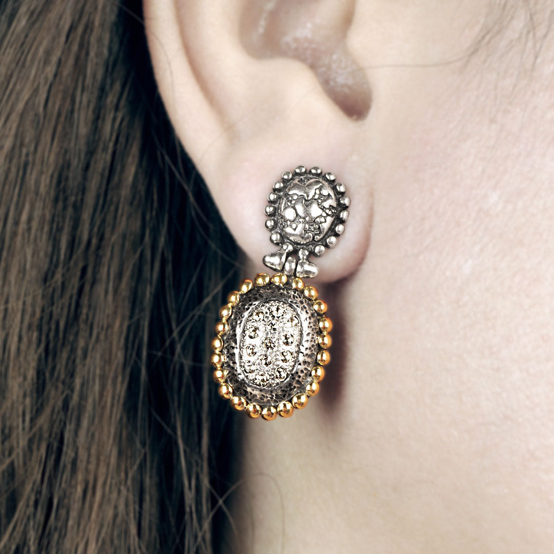 Gold & Silver earring, 18K gold accents, plaster motif collection, white topaz pave, stud