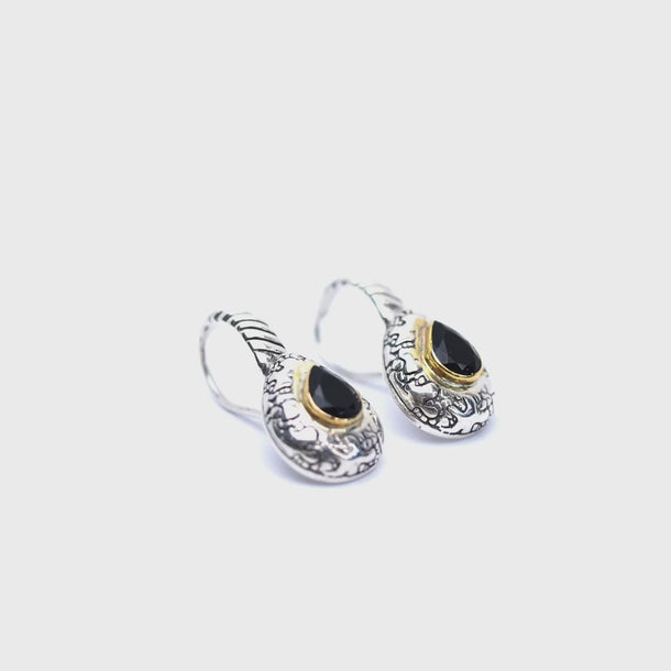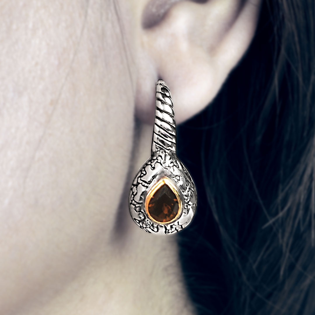 Silver and Gold earring, pear shape, Plaster texture motif, set with smoky quartz pear shape