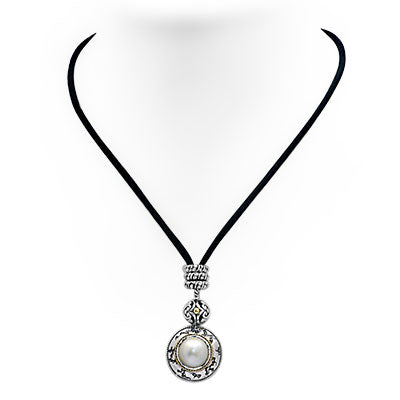 Silver & Gold Necklace White Mabe, Balinese Plaster Motif