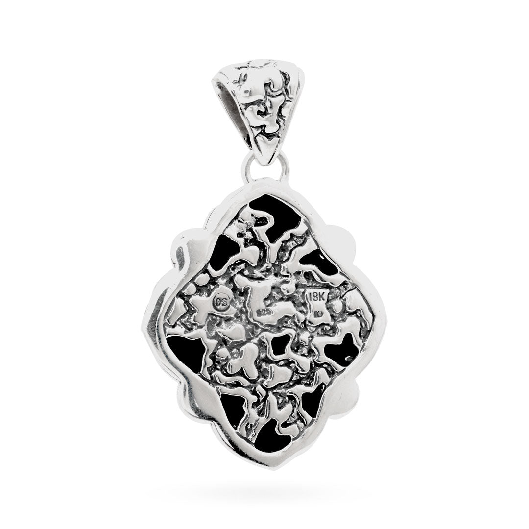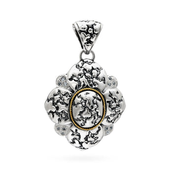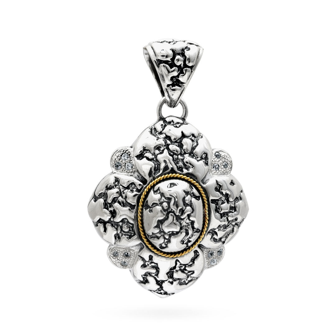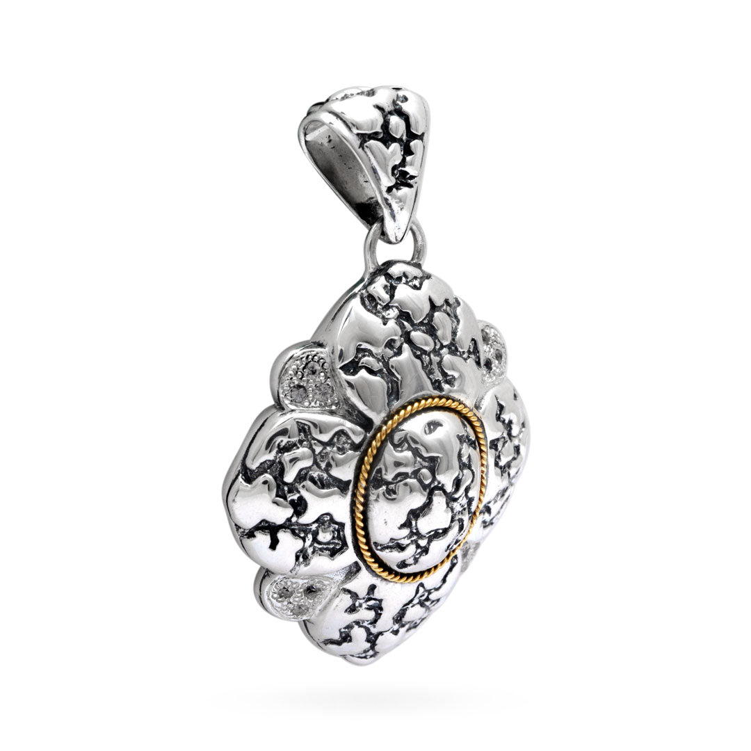 Silver and Gold Pendant, flower shape, Plaster texture motif, set with white Zircon pave setting