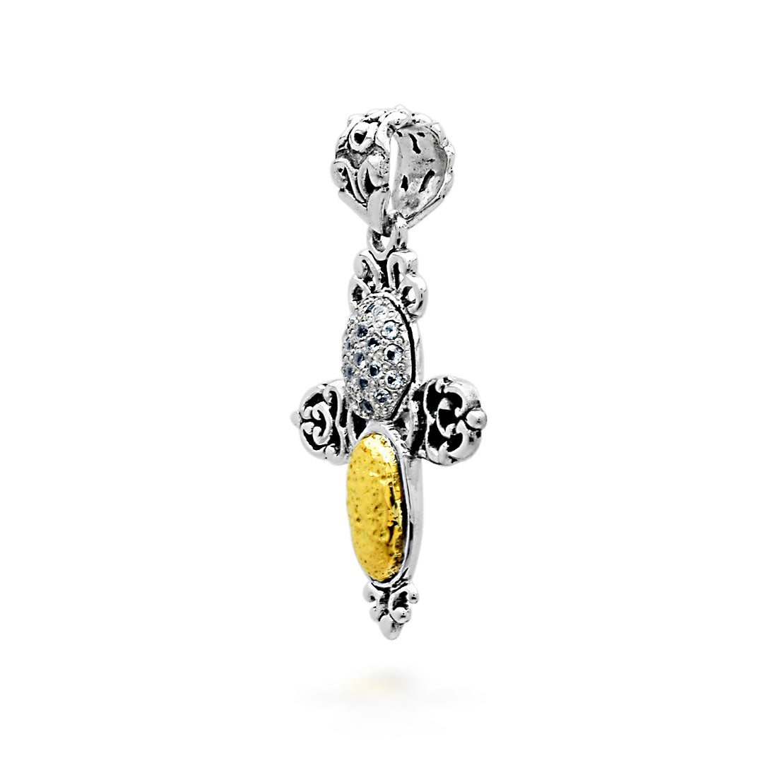 Gold & Silver cross pendant, 18K gold hammer with White Topaz pave setting