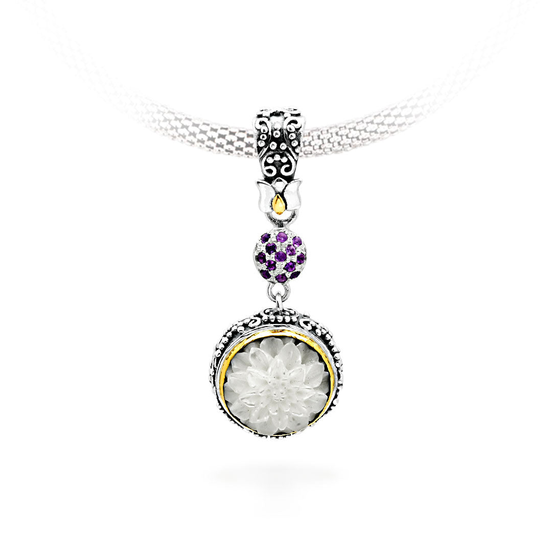 Gold & Silver earring, bali motif, MOP rose carved, 18K gold bezel, Amethyst pave setting
