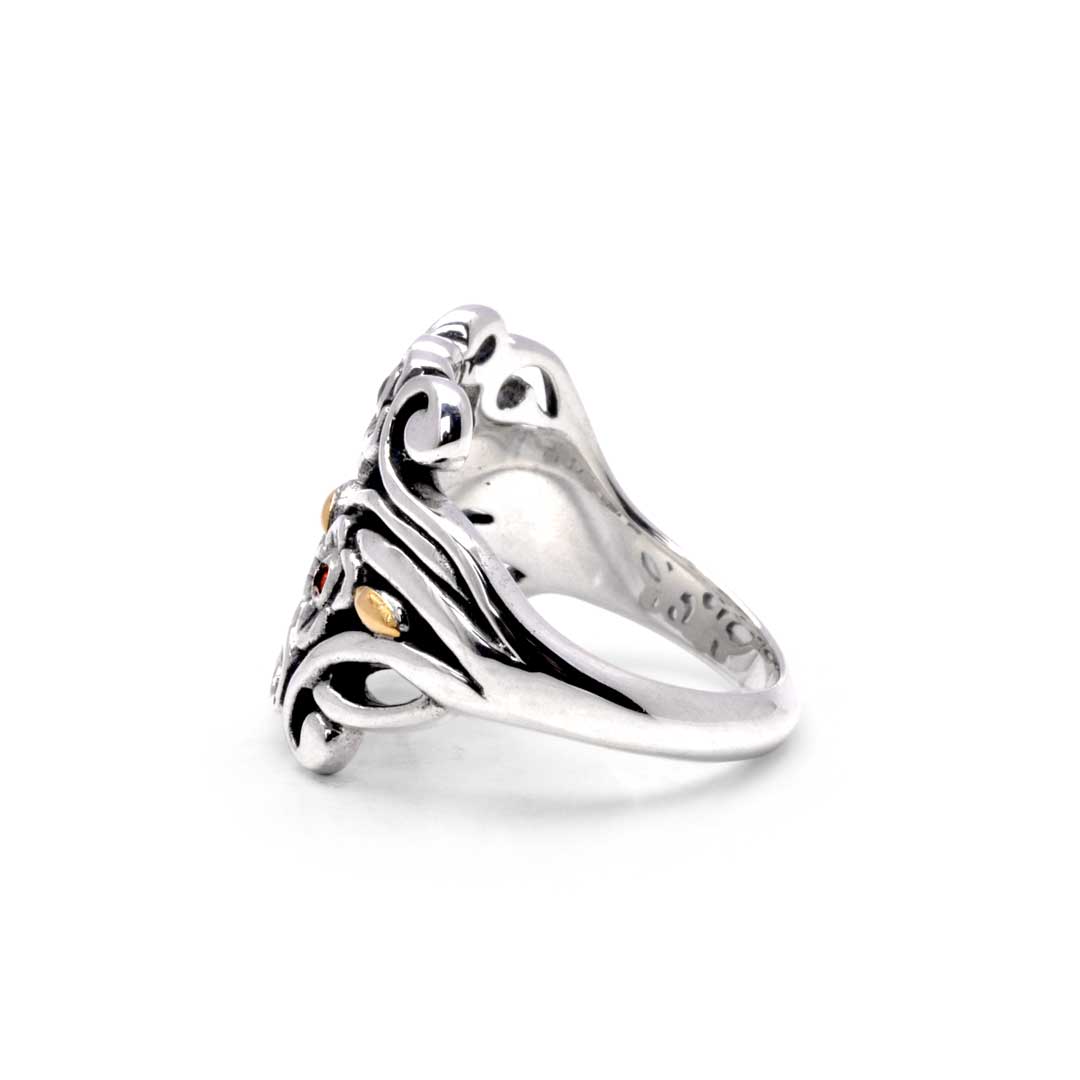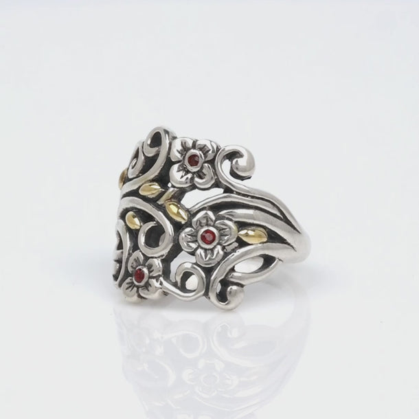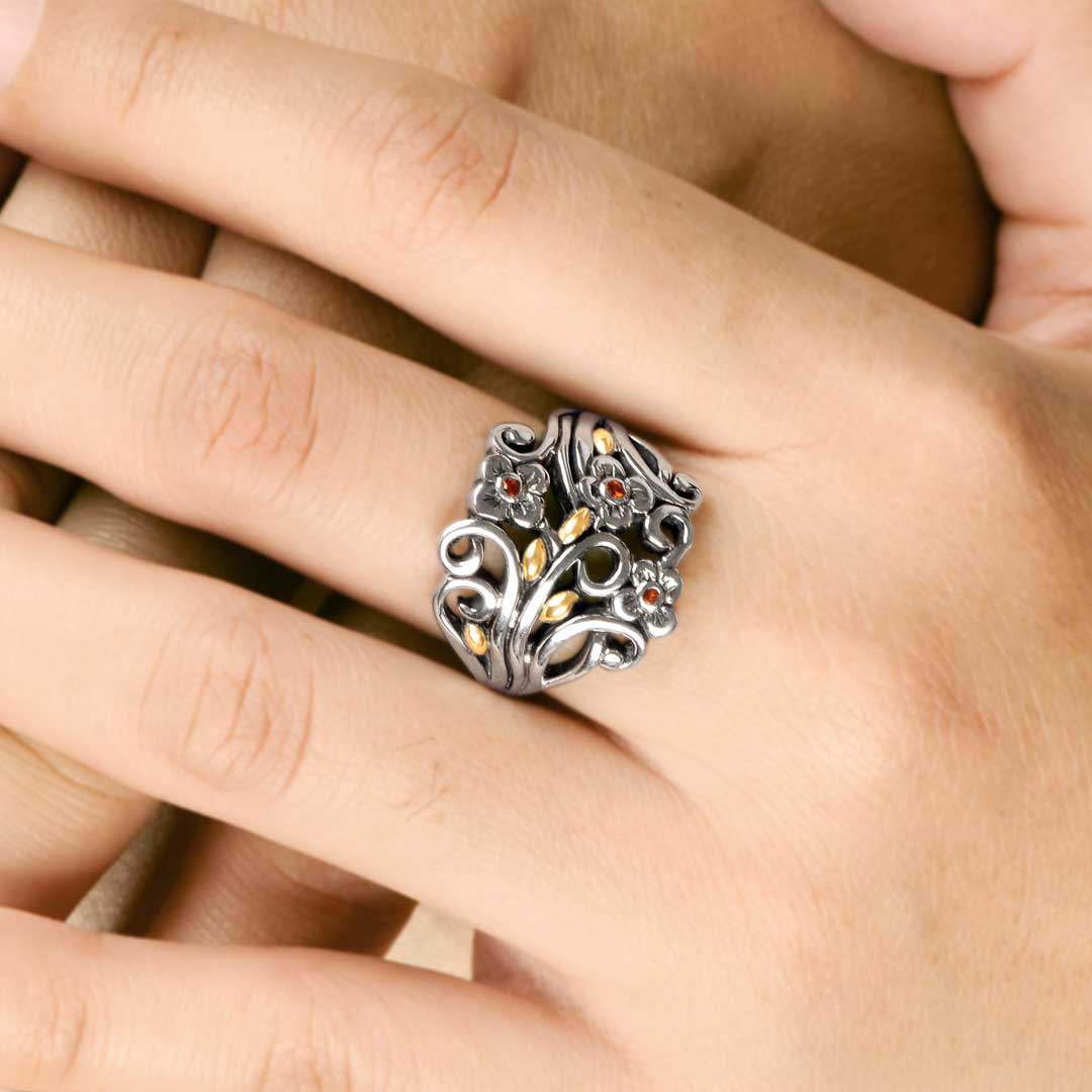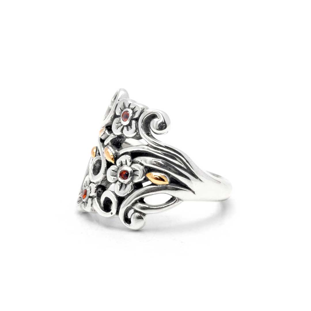 Anillo de oro y plata con granate y motivo floral
