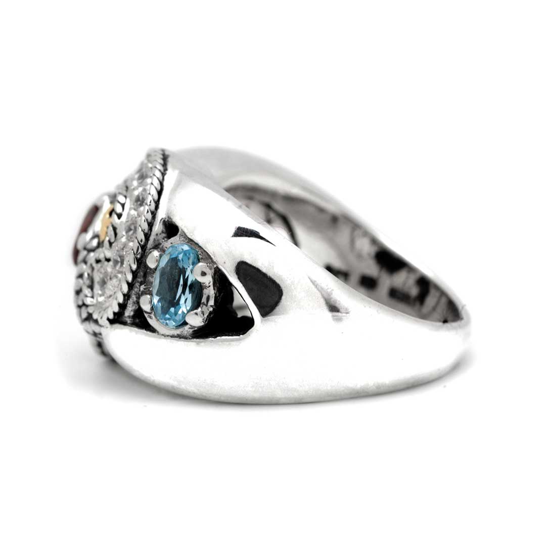 Use the white side of the provided polishing cloth to gently wipe silver portions clean. Remove any remaining tarnish or impurities with mild diluted soap and warm water. Dry thoroughly before storing in its jewelry pouch.