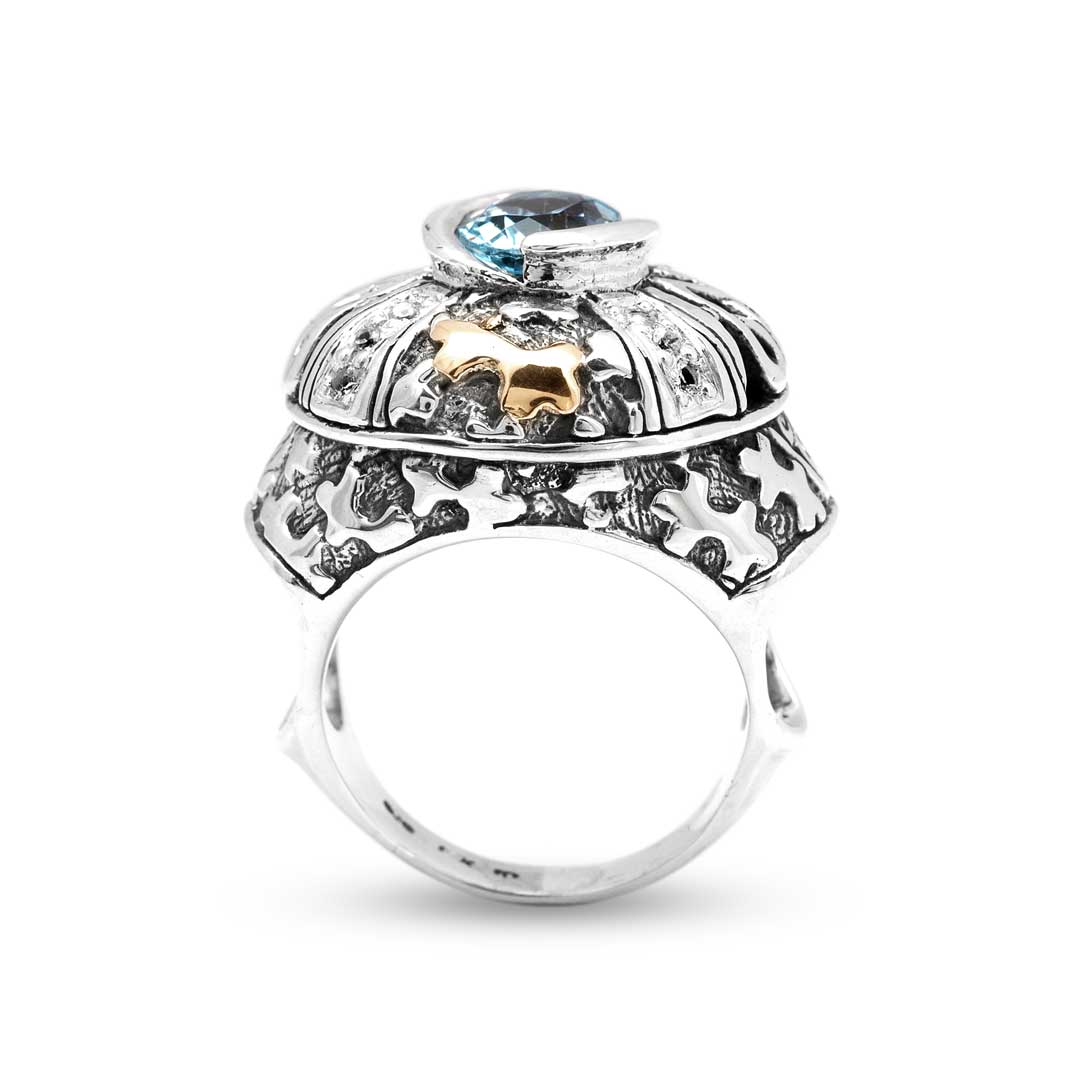 Anillo de oro y plata con topacio azul cielo natural con motivo de rompecabezas