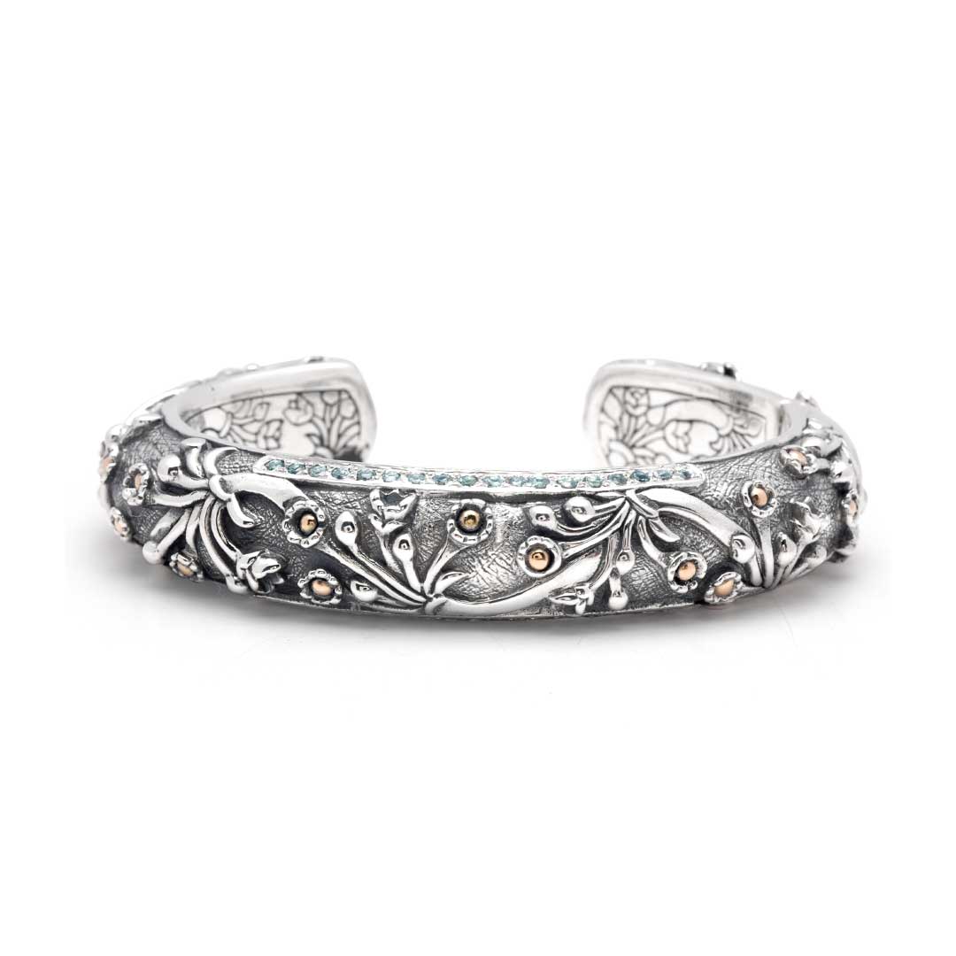 Brazalete de plata y oro con topacio azul y motivo de jazmín acuático