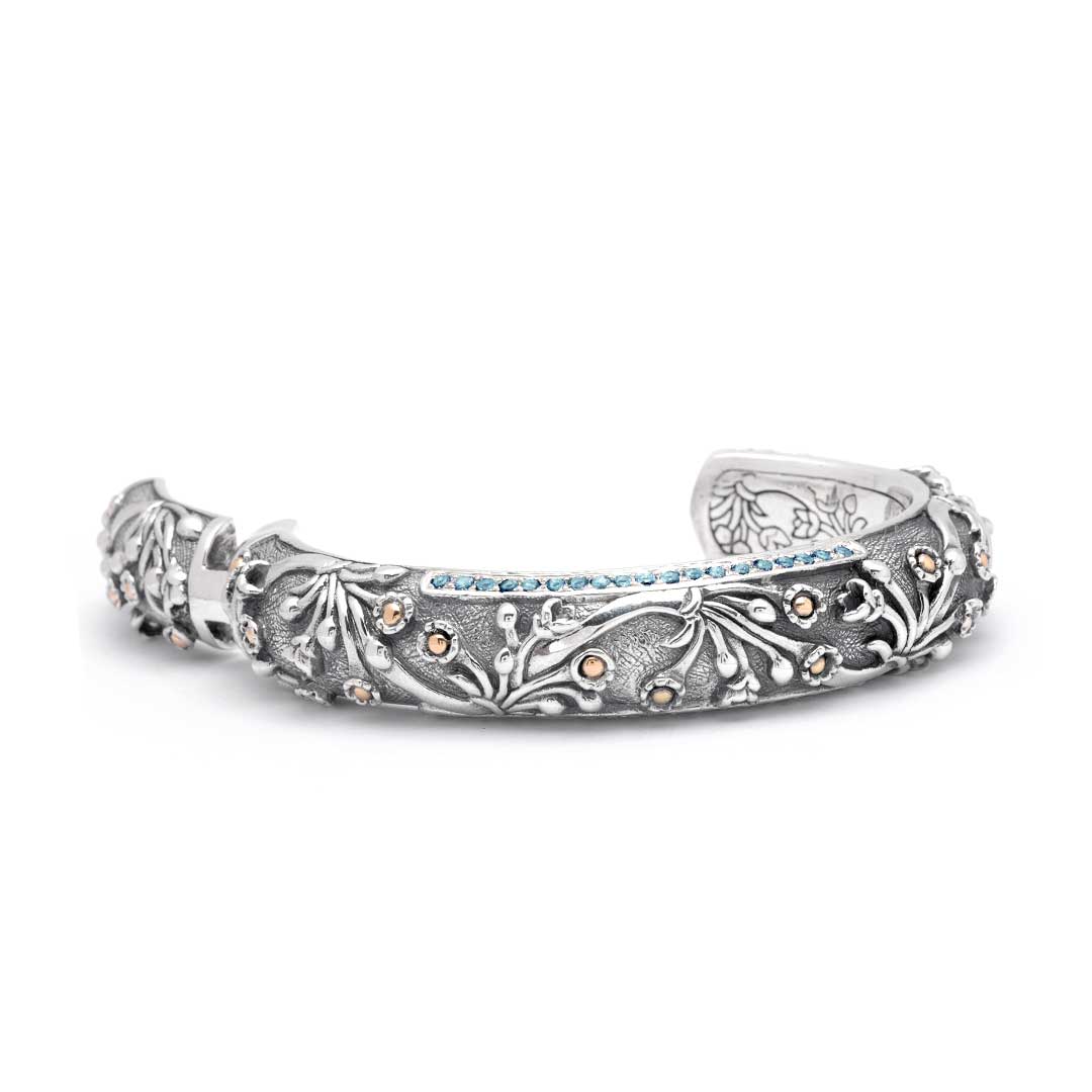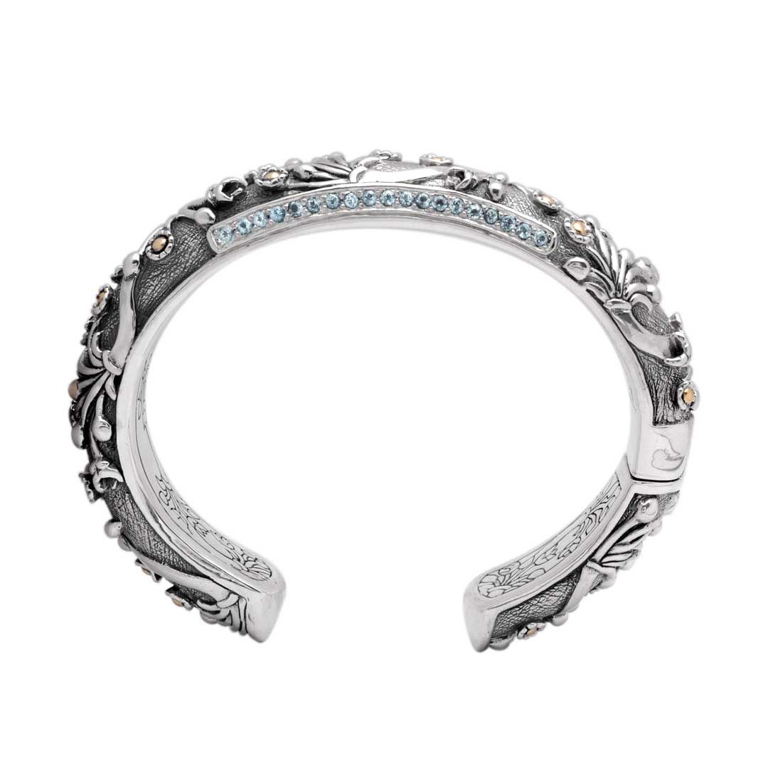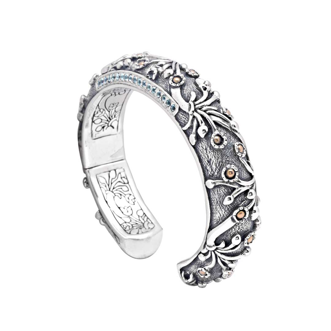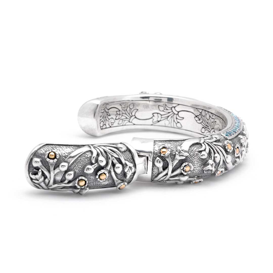 Pulsera Kick Cuff de plata y oro con topacio azul y motivo de jazmín acuático