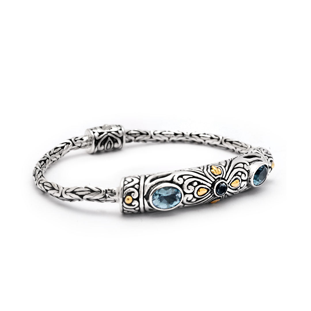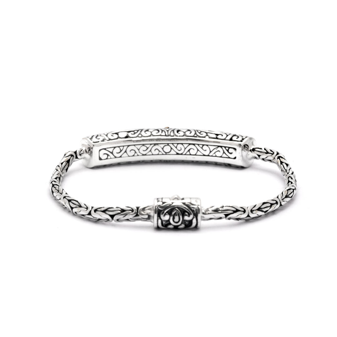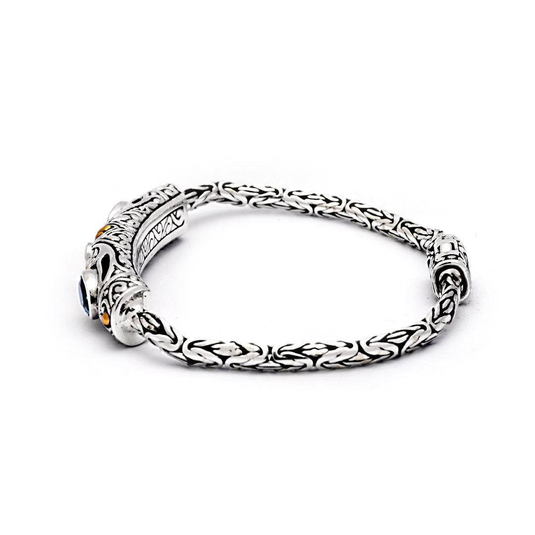 Pulsera de plata y oro con amatista, motivo balinés, cadena Borobudur de 3x4
