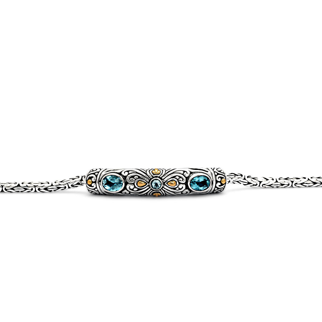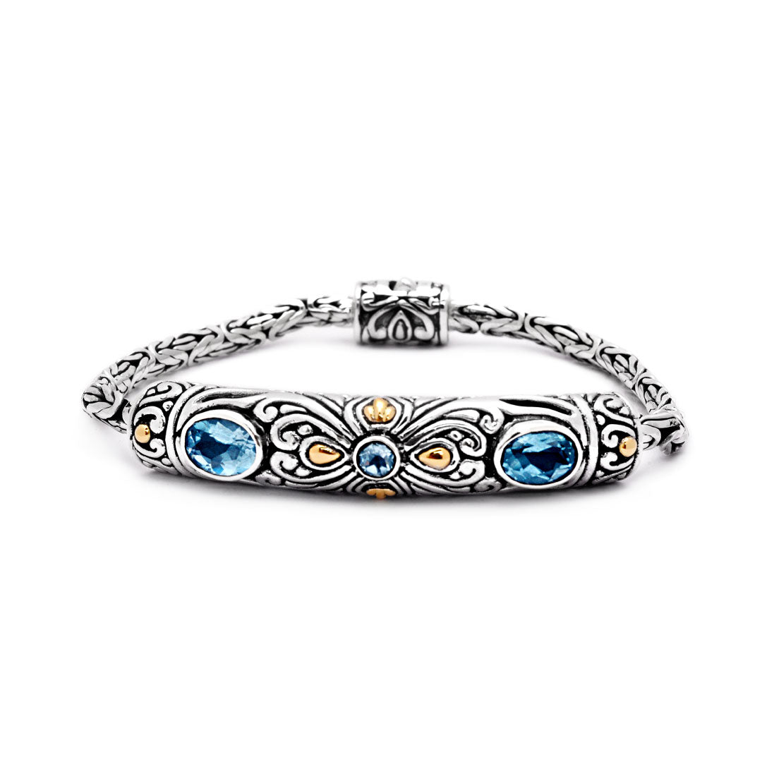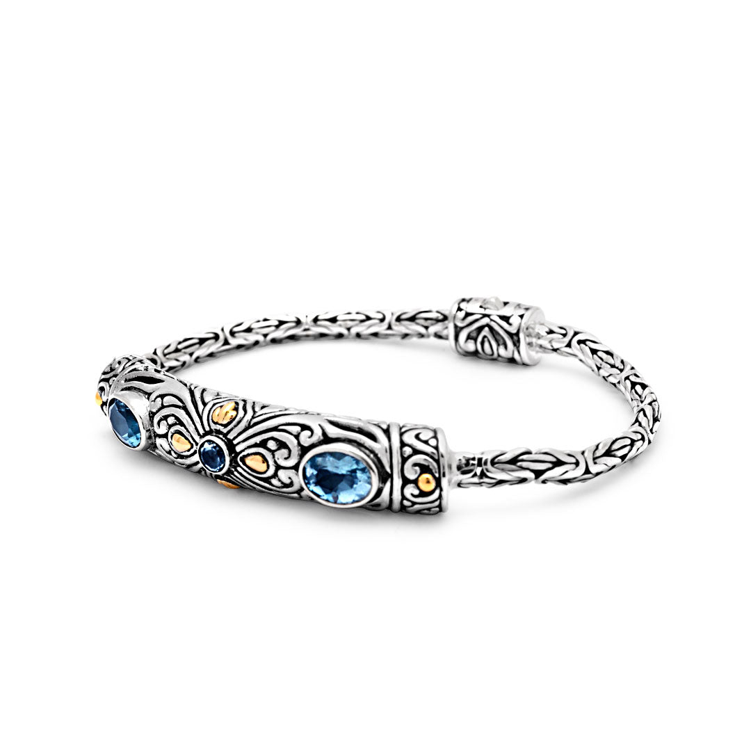 Pulsera de plata y oro con amatista, motivo balinés, cadena Borobudur de 3x4