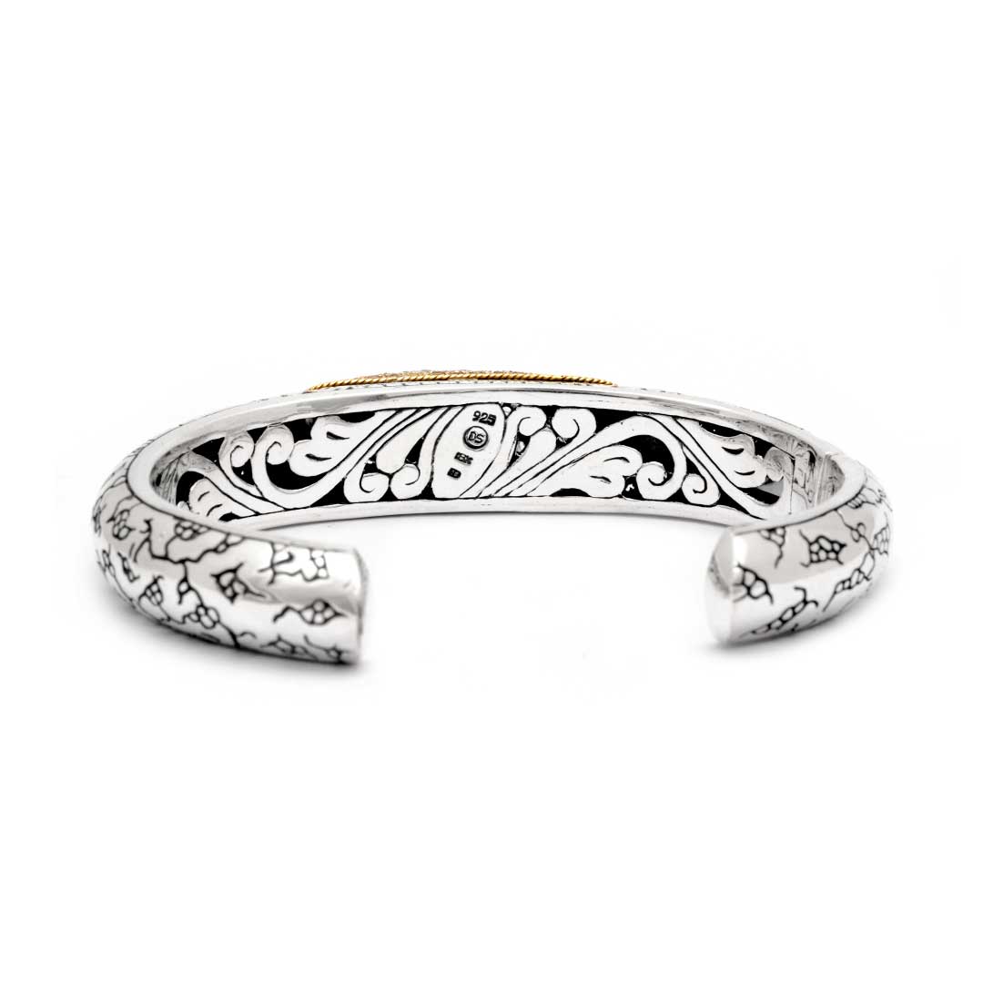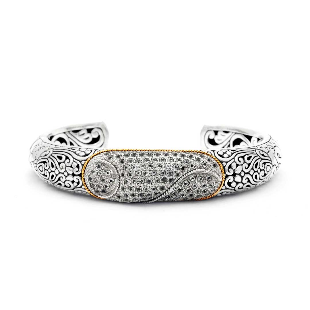 Pulsera de plata y oro con topacio blanco y motivo de cocodrilo balinés