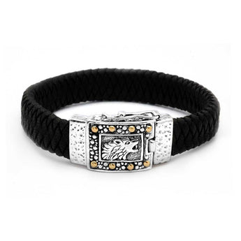 Pulsera de lobo de plata y oro con cuero negro, motivo Bali