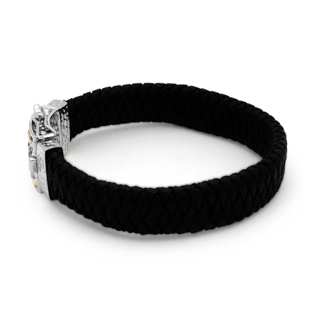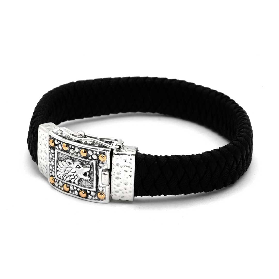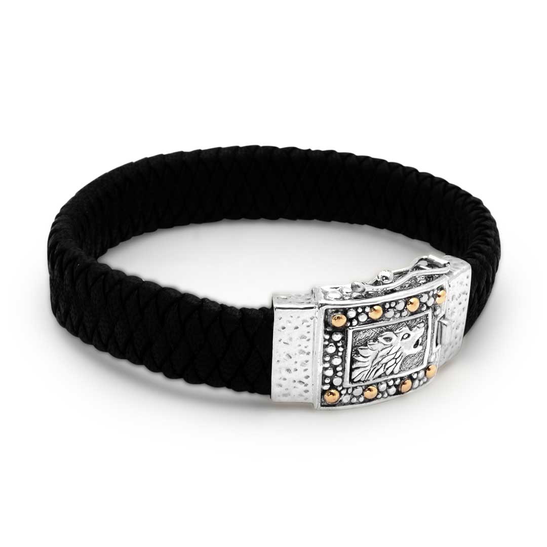 Pulsera de lobo en plata y oro con cuero negro y motivo Bali