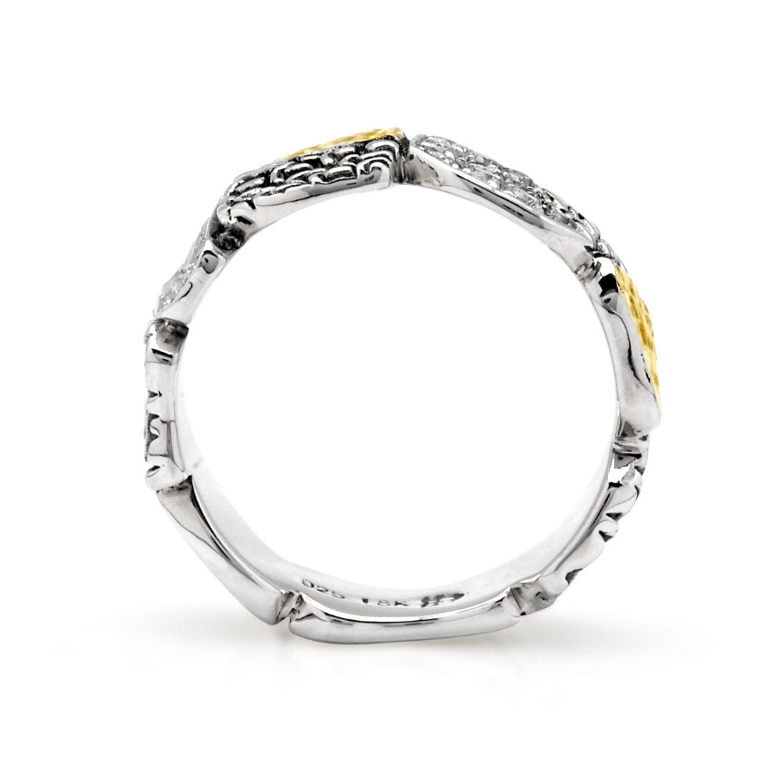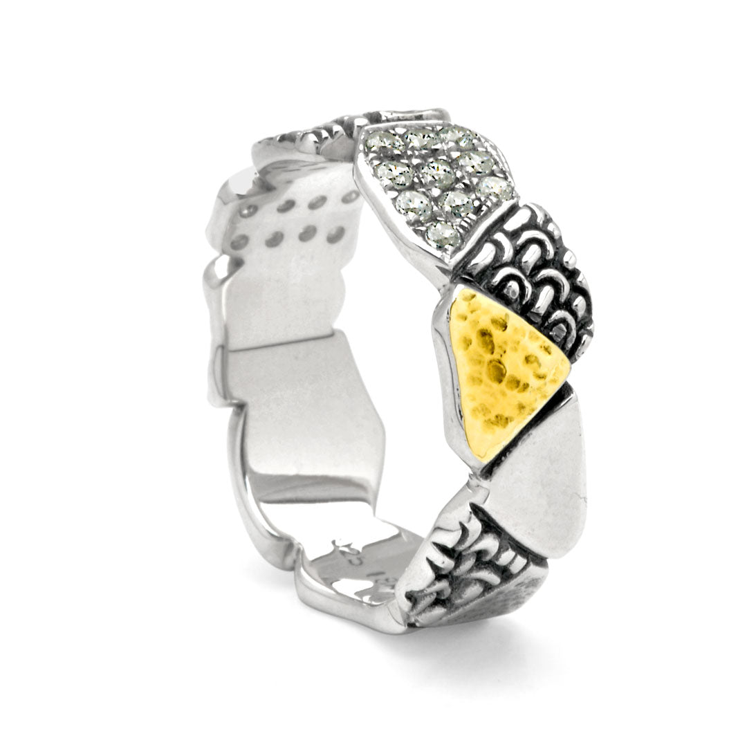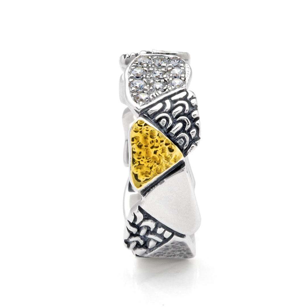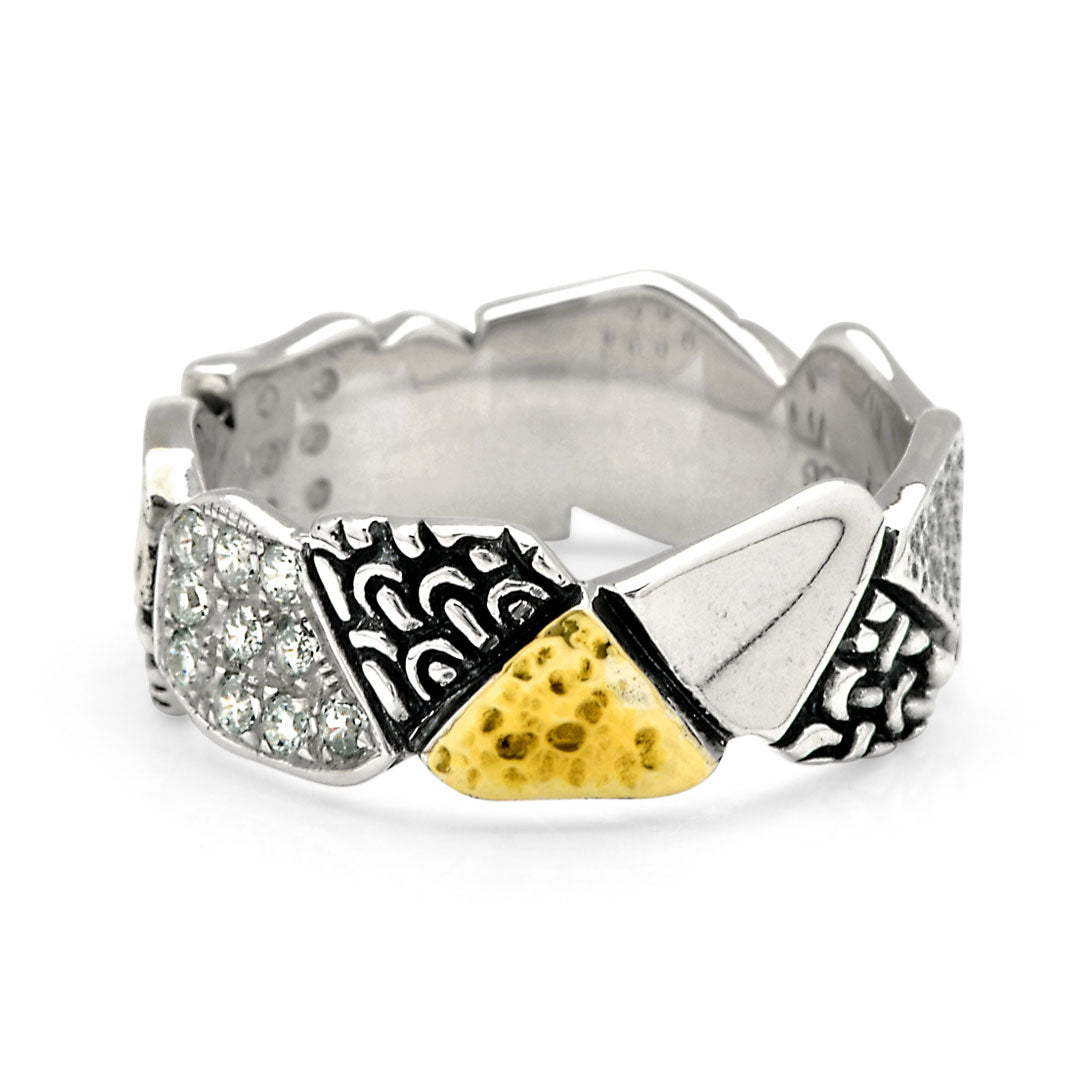 Anillo geométrico de oro y plata con pavé de zafiro negro