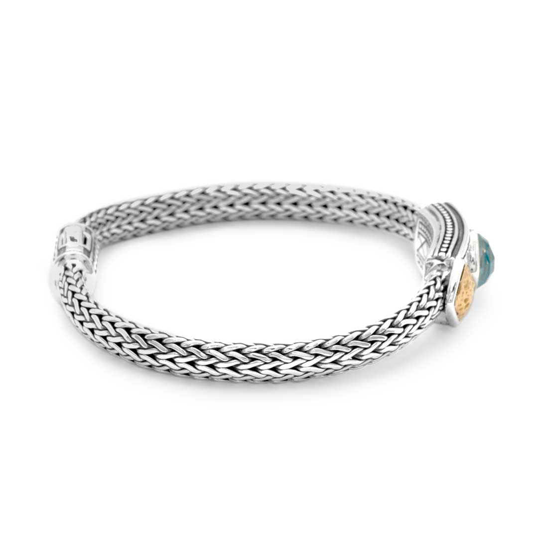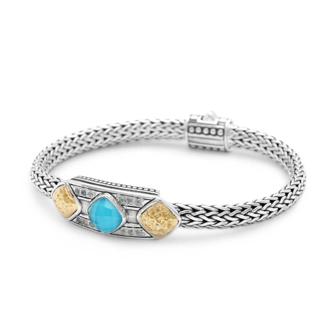 Pulsera de oro y plata con cristal turquesa, cojín de 8 mm, pavé de topacio blanco