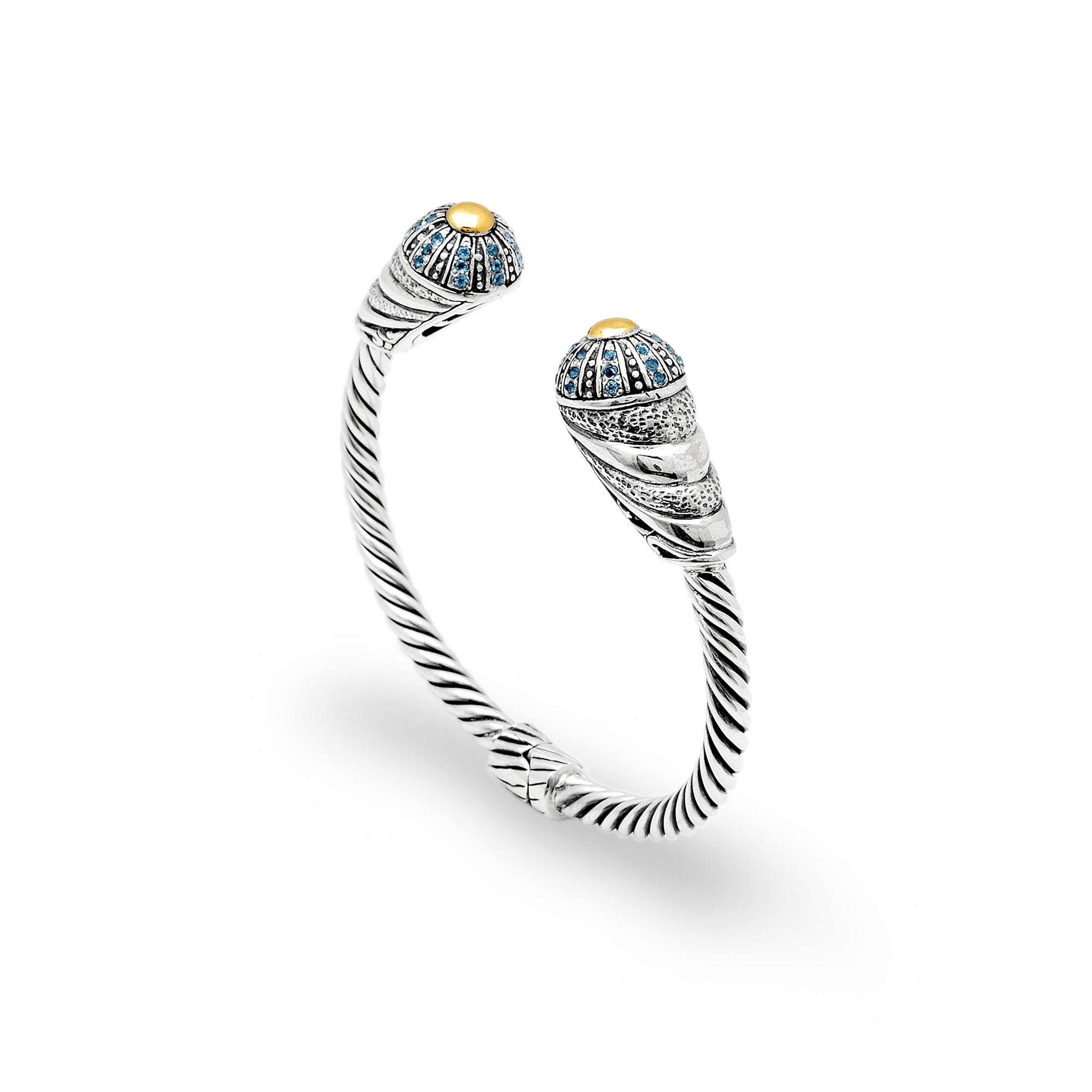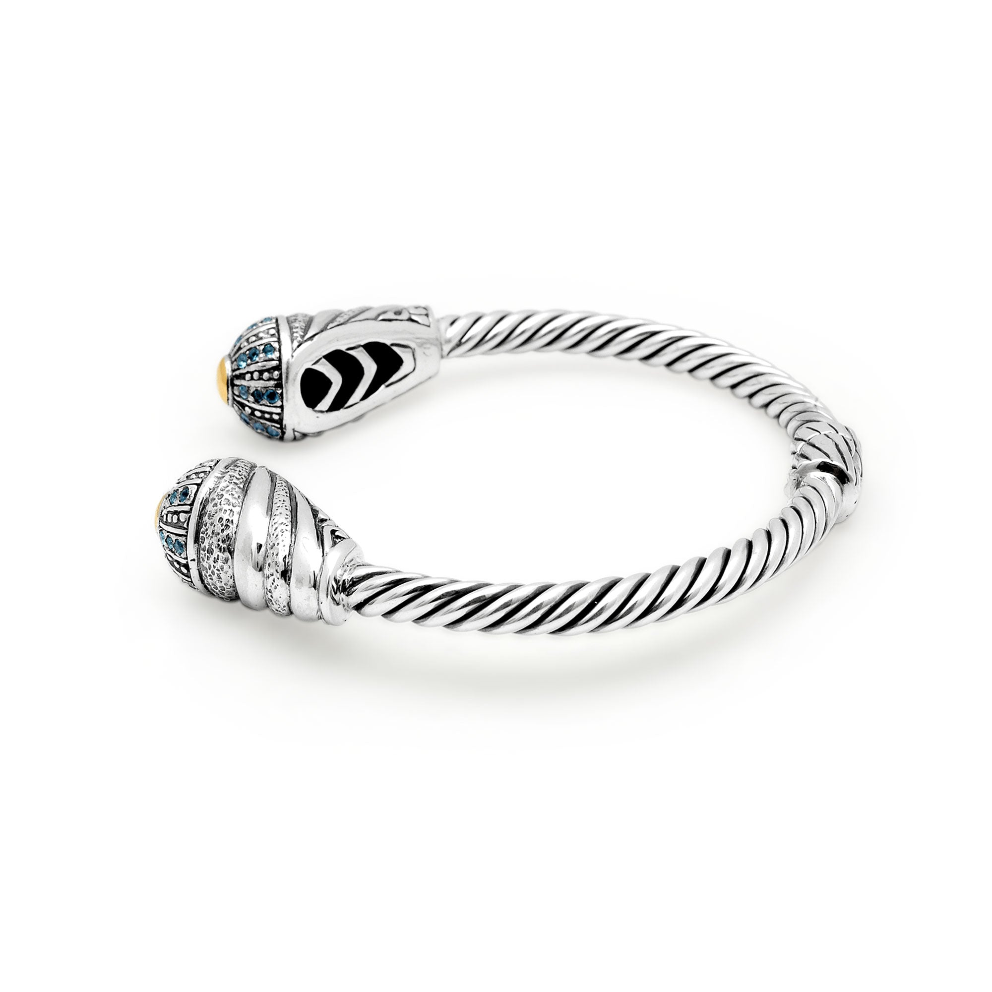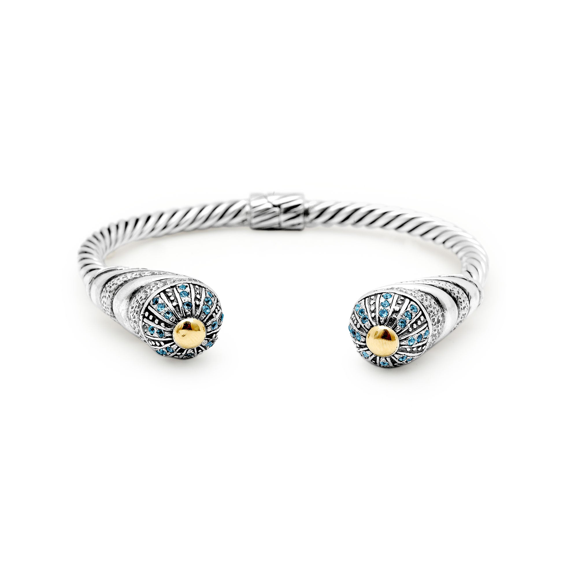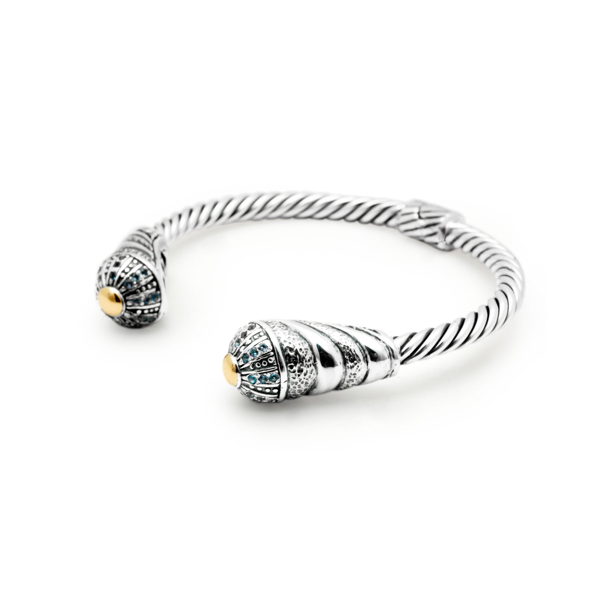 Brazalete tipo cable de oro y plata con pavé de topacio azul