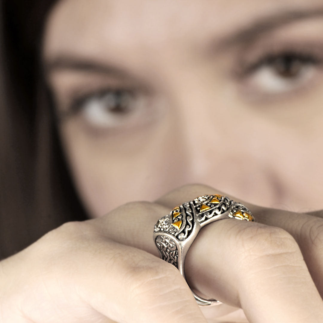 Bague en or et argent ornée d'un motif balinais serti de zirconiums cubiques