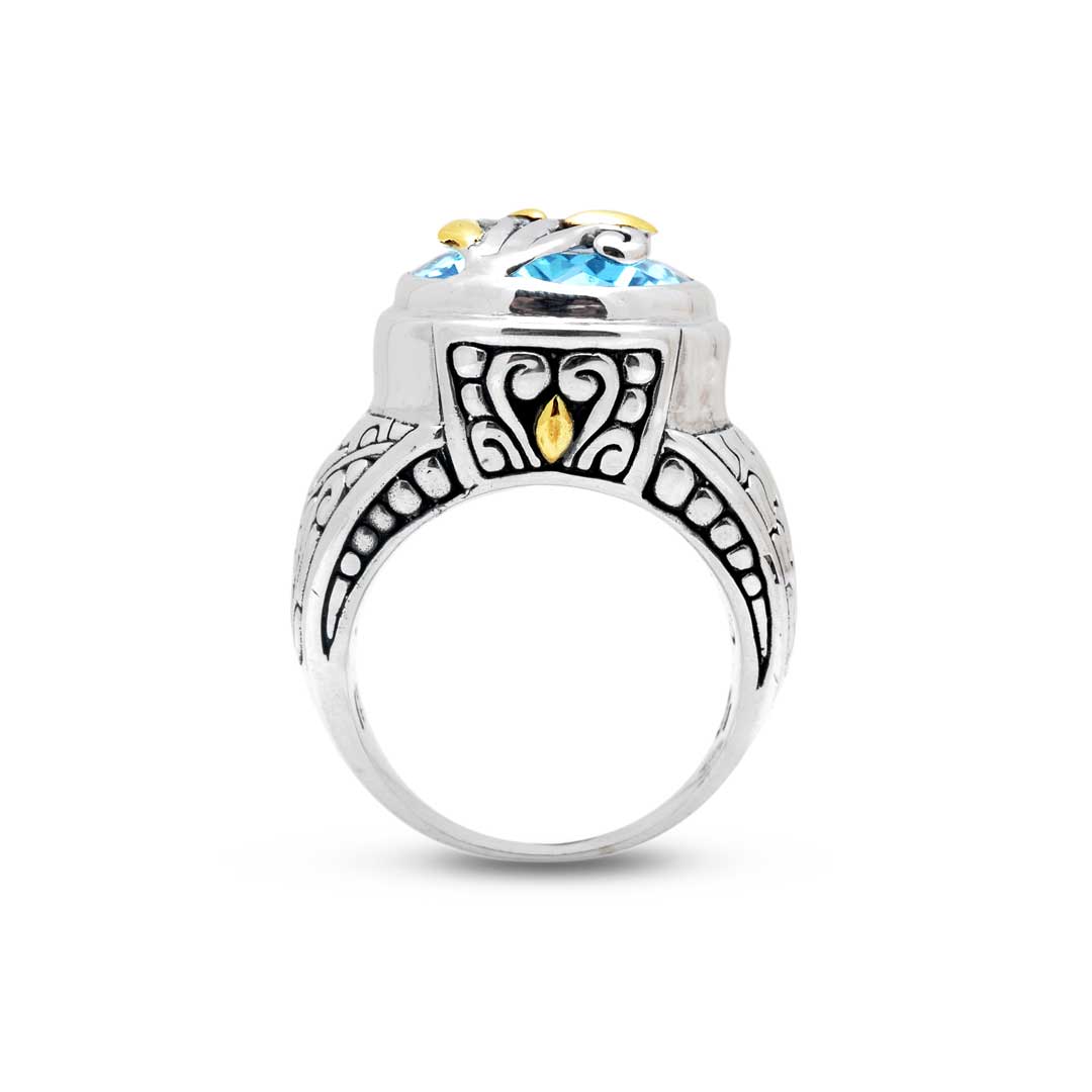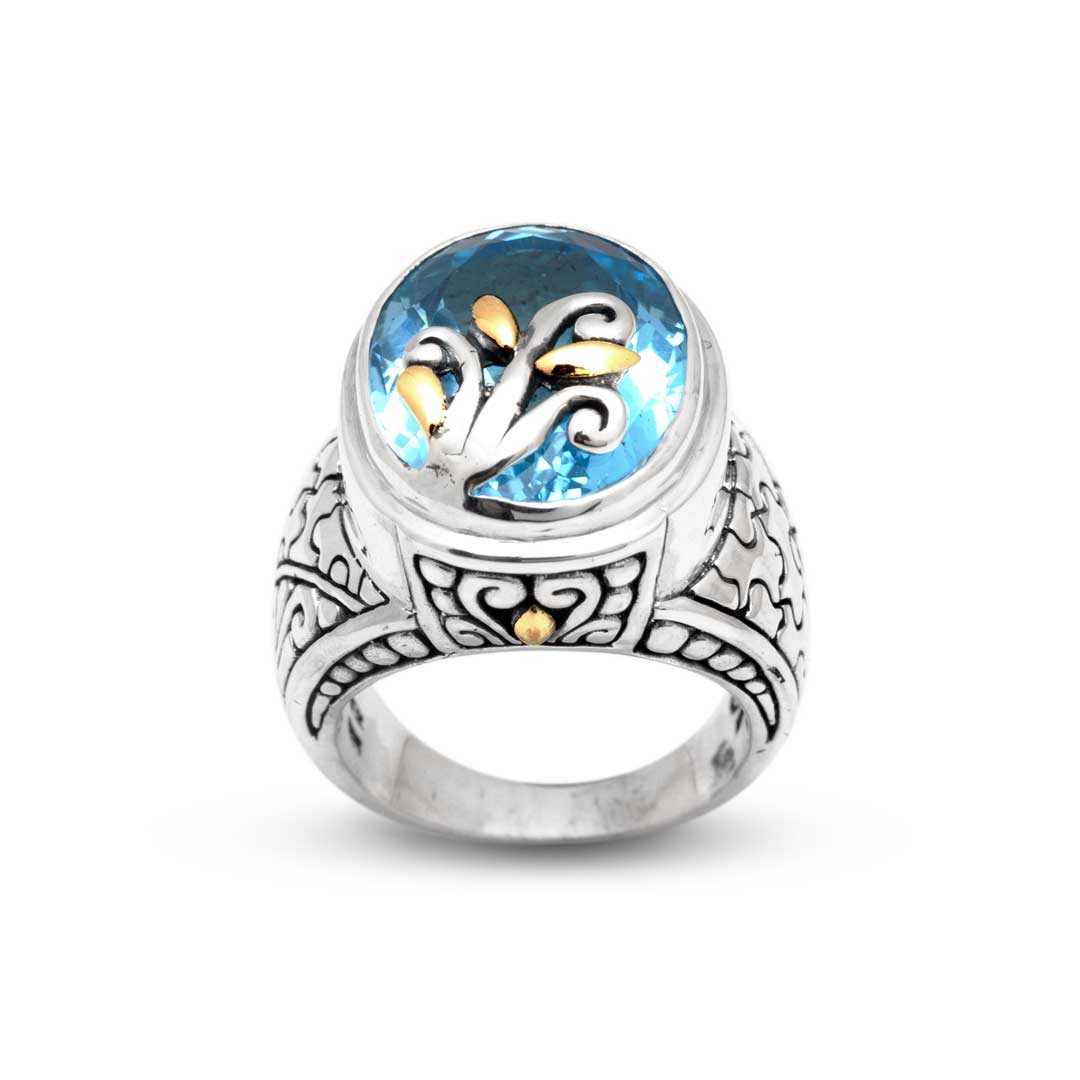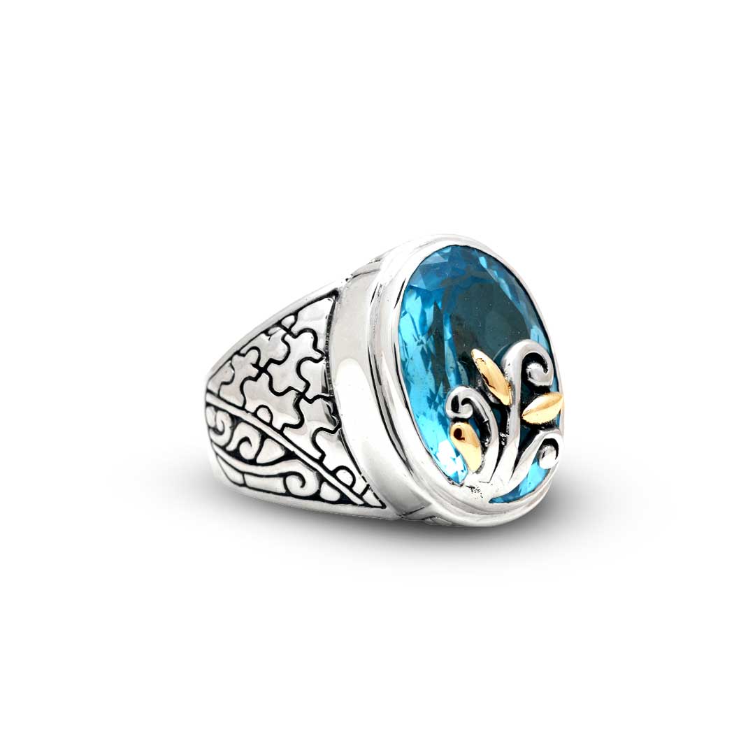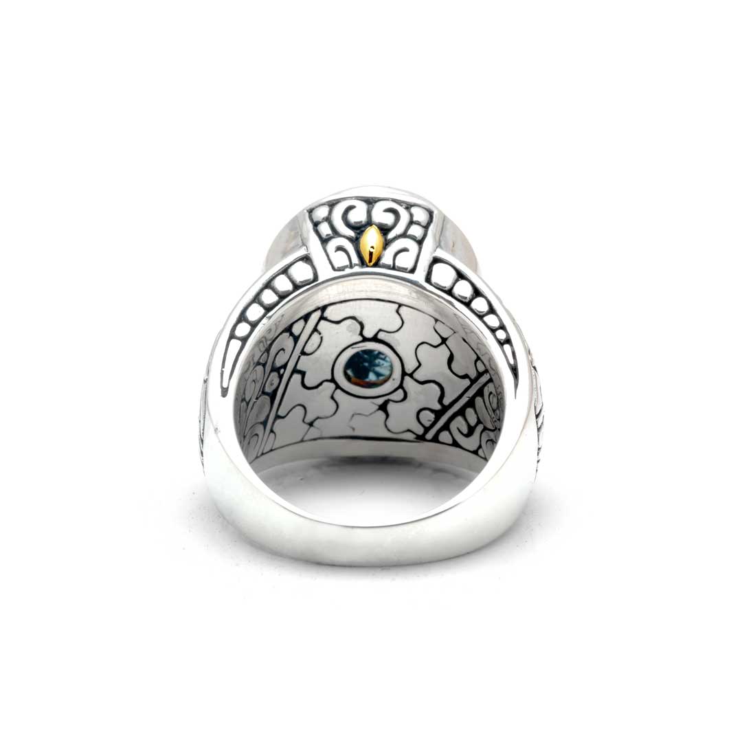 Bague en or et argent ornée d'une pierre de quartz bleu, d'un puzzle et d'un motif balinais