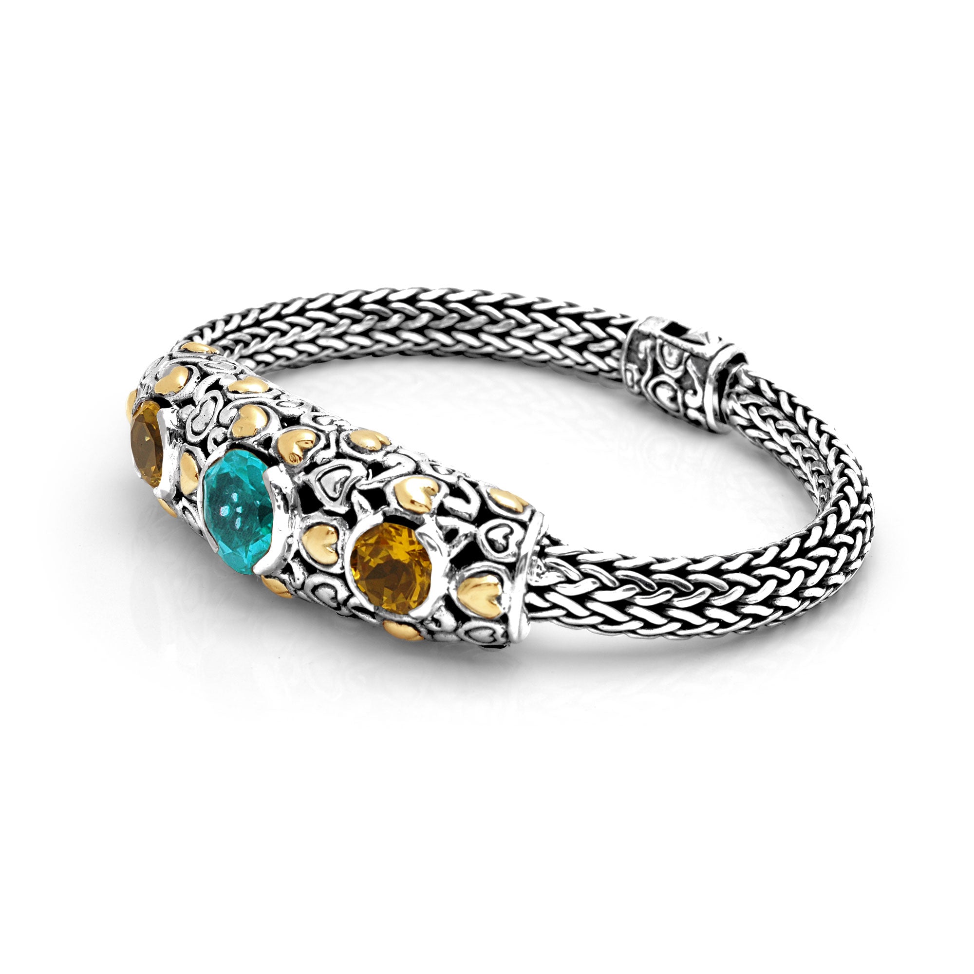 Bracelet en or et argent, topaze bleue, citrine et quartz, fait main, motif balinais