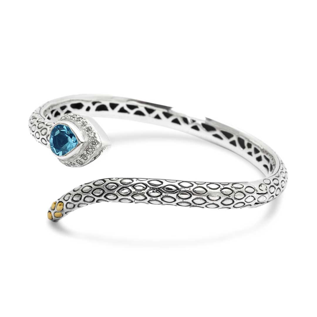 Bracelet en argent et or orné de zirconiums cubiques et de topazes bleues, motif serpent