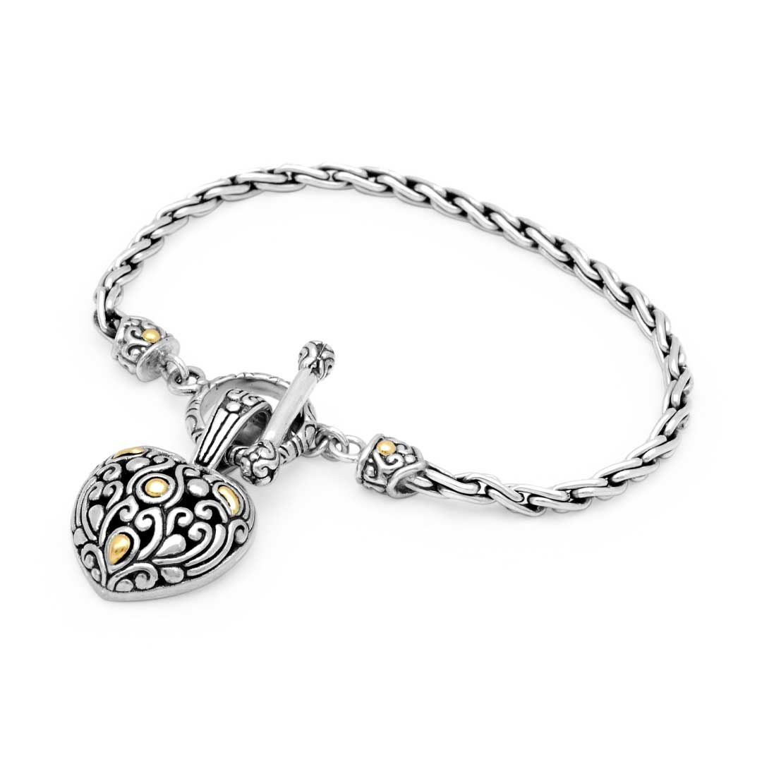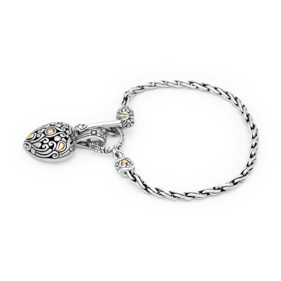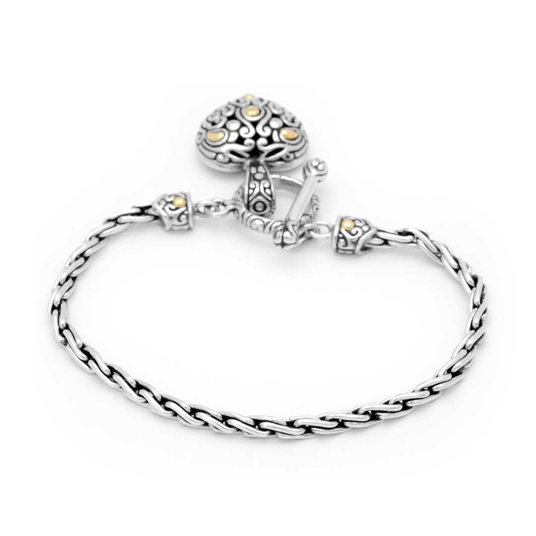 Bracelet en argent et or, maille blé 3 mm, pendentif cœur, motif balinais