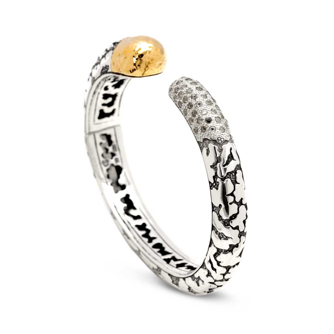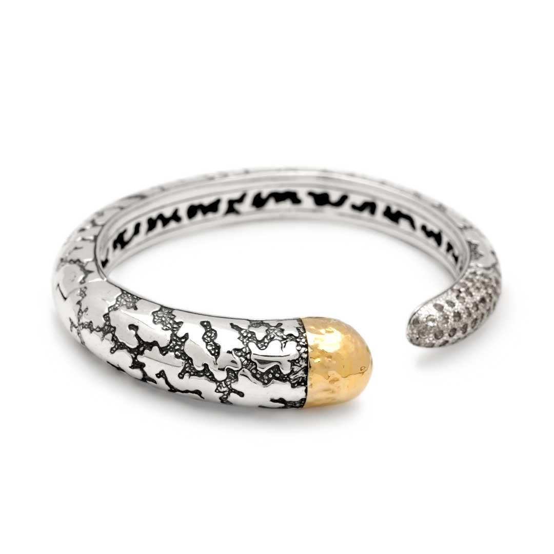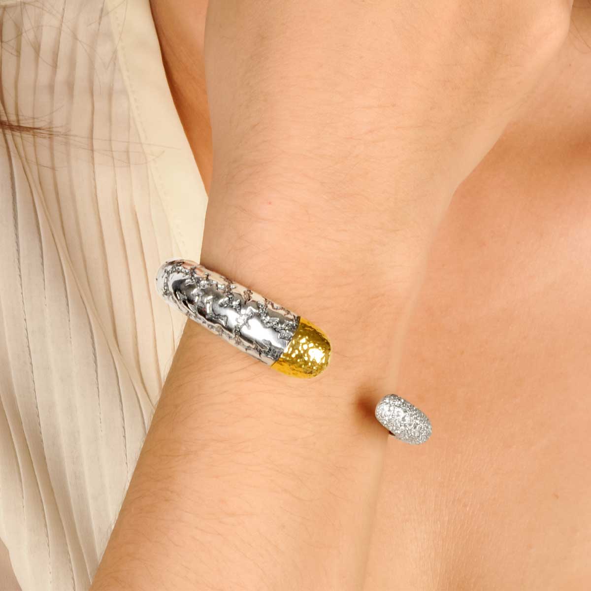 Bracelet manchette argenté et doré, motif effet plâtre. Accent en or 18 carats serti de topazes blanches.