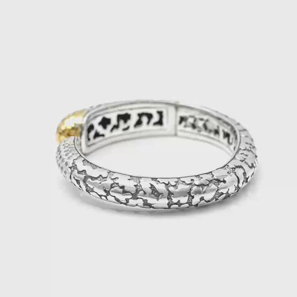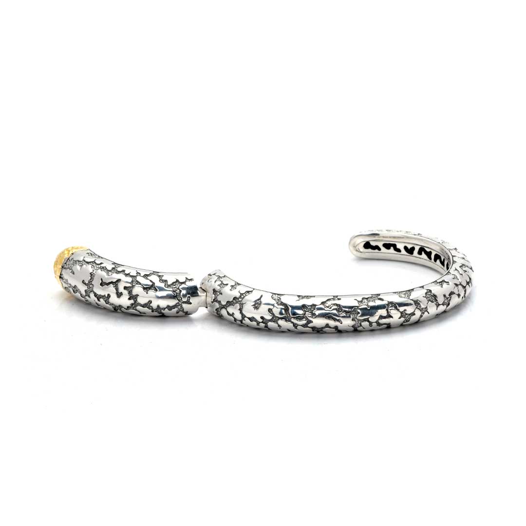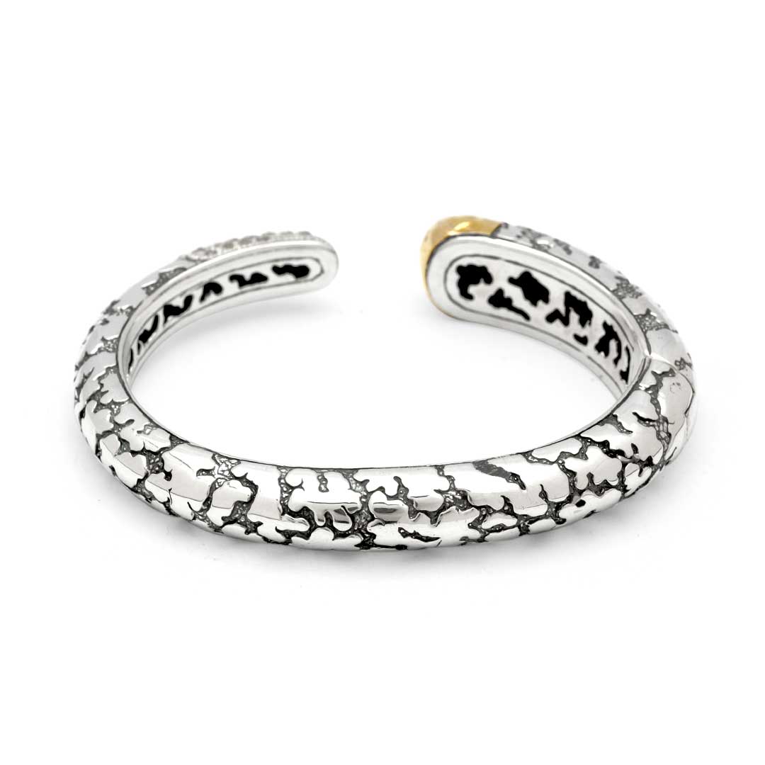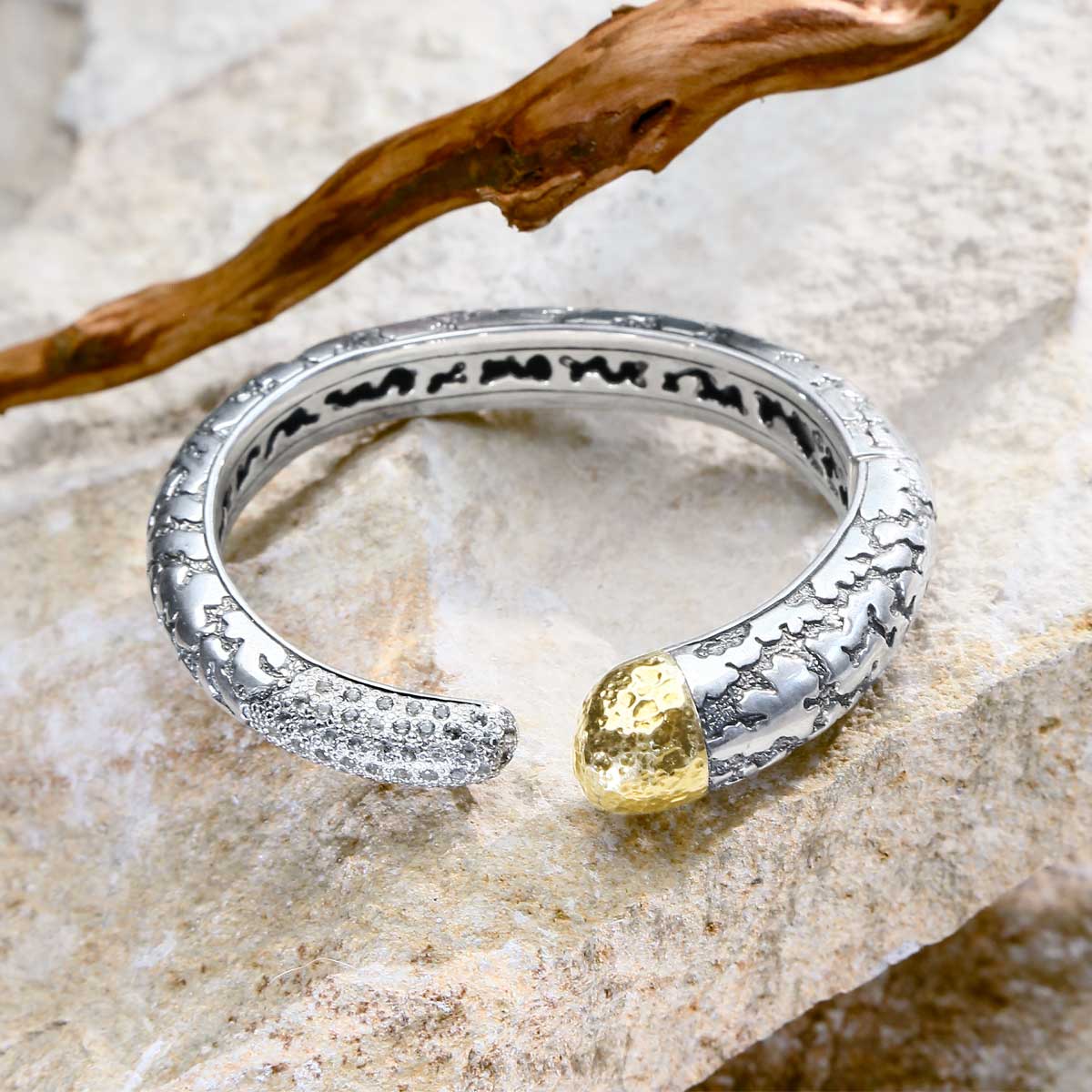 Bracelet manchette argenté et doré, motif effet plâtre. Accent en or 18 carats serti de topazes blanches.