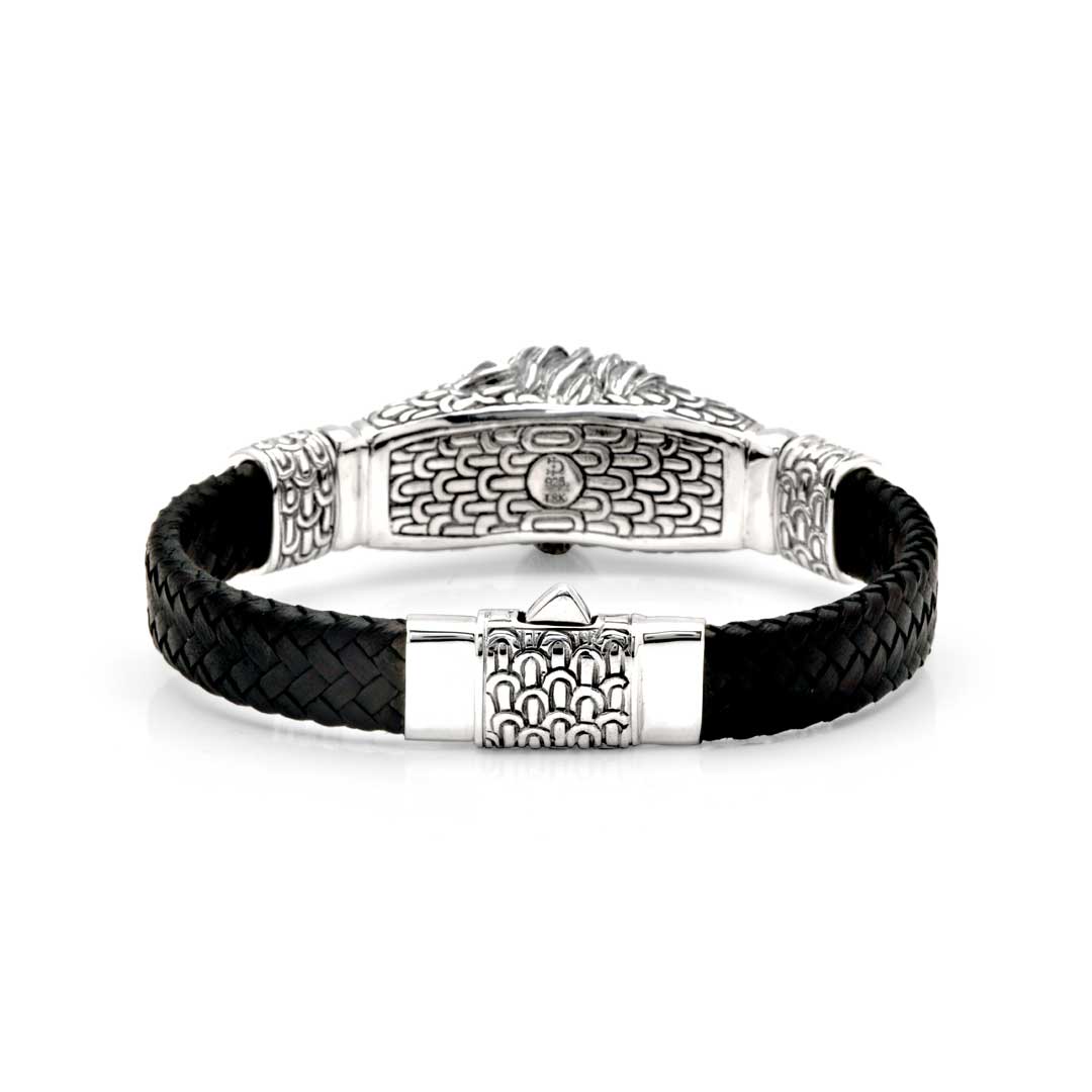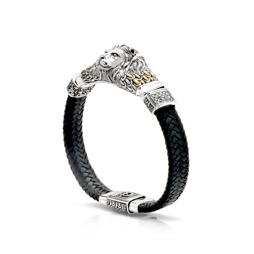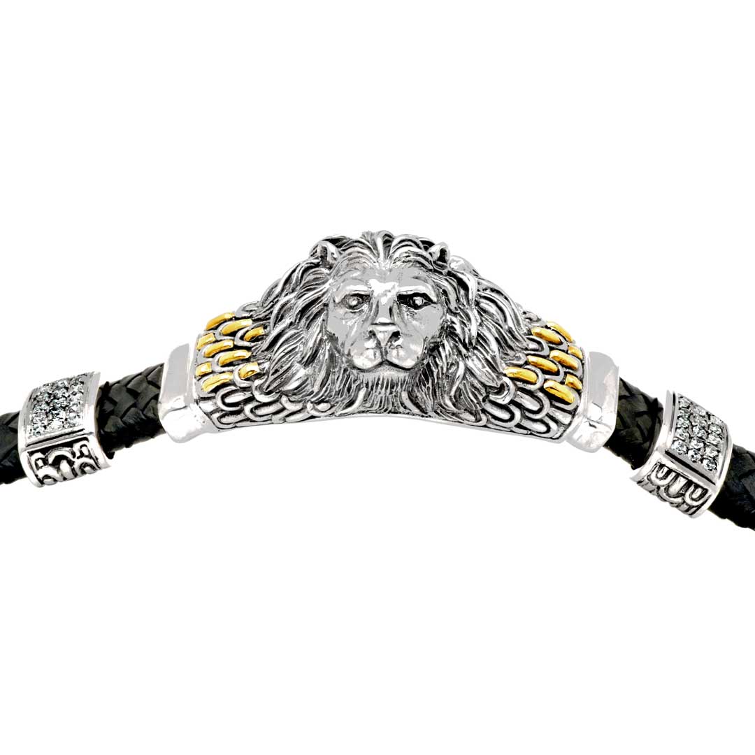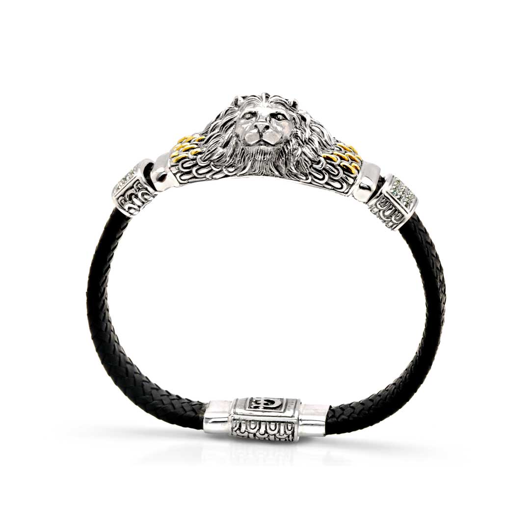 Bracelet en cuir doré et argenté, tête de lion ornée d'un motif sisik naga, pavé de zirconiums blancs, bracelet en cuir noir de 11 mm, fermoir à ressort
