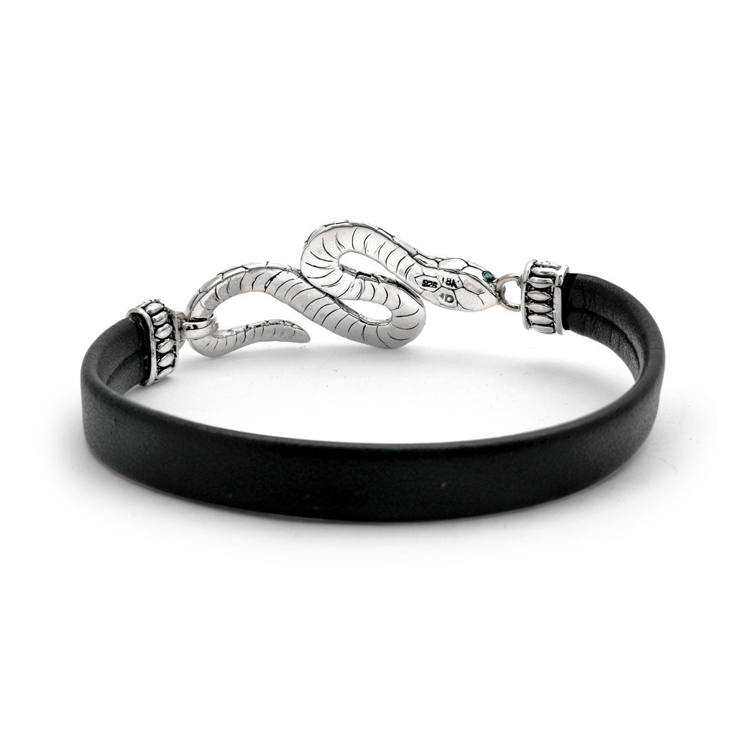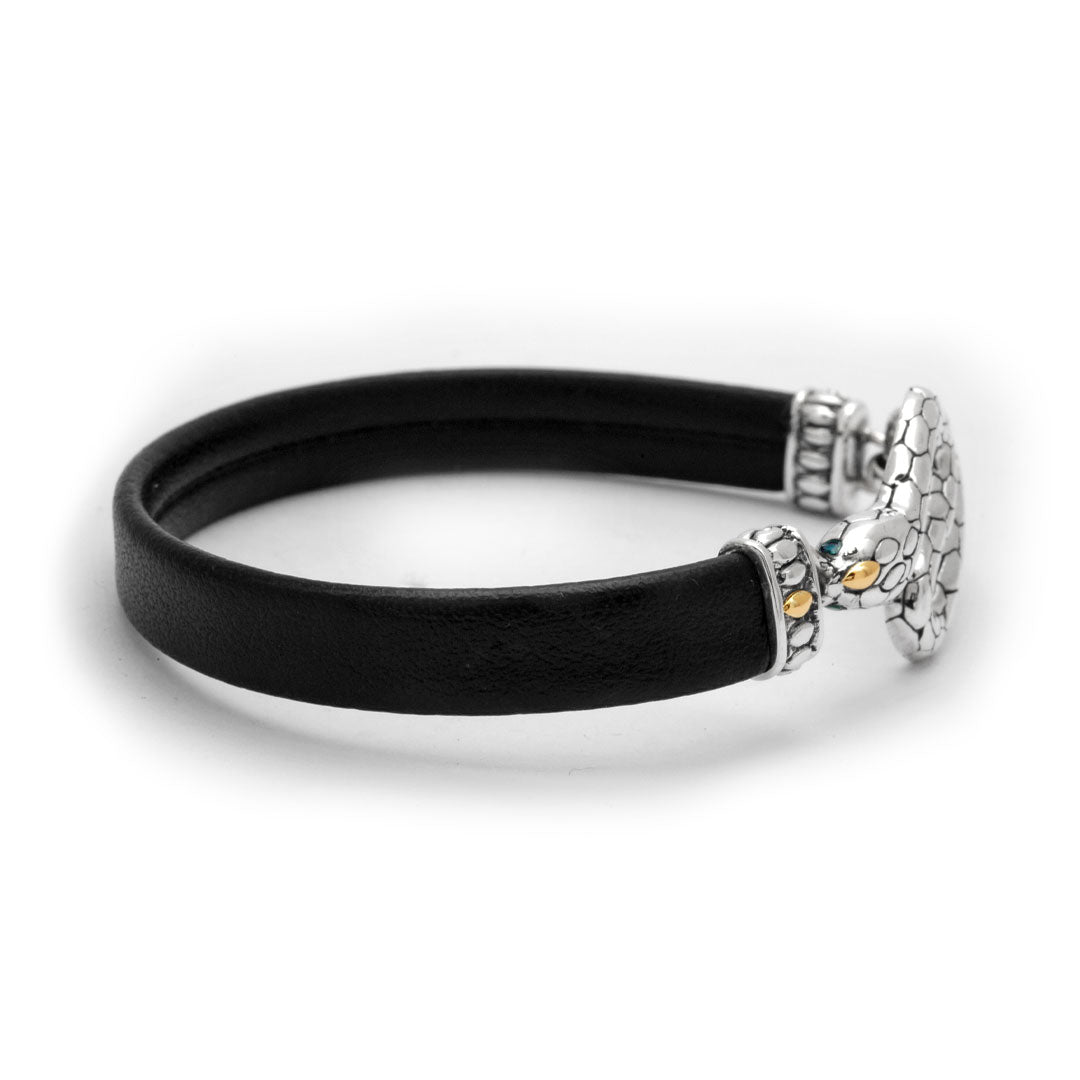 Bracelet en argent et or avec yeux en topaze bleue et bracelet en cuir plat noir, motif serpent