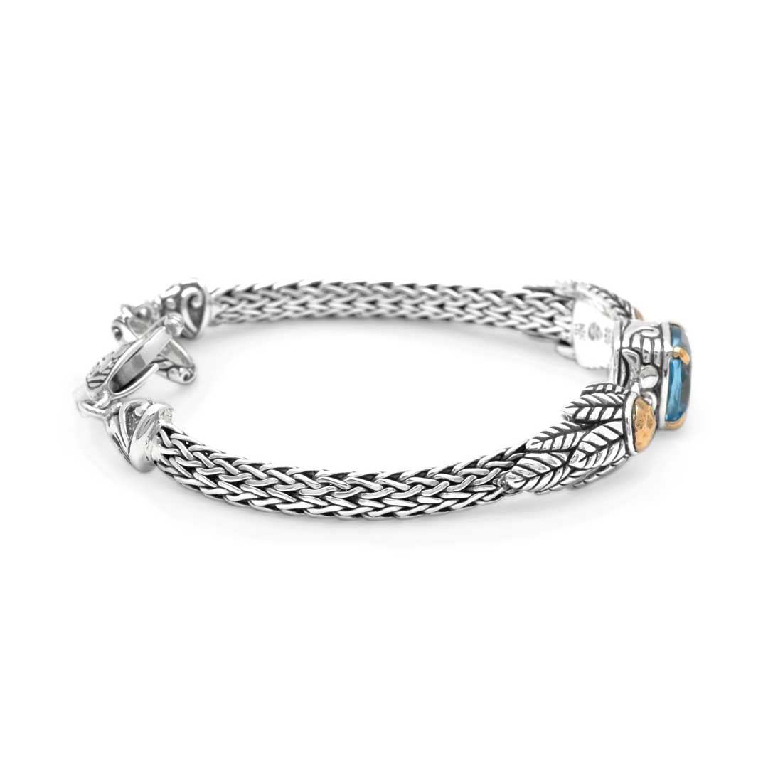 Bracelet en or et argent, quartz bleu coussin 10 mm, détails en or 18 carats. Chaîne ovale 3x5.