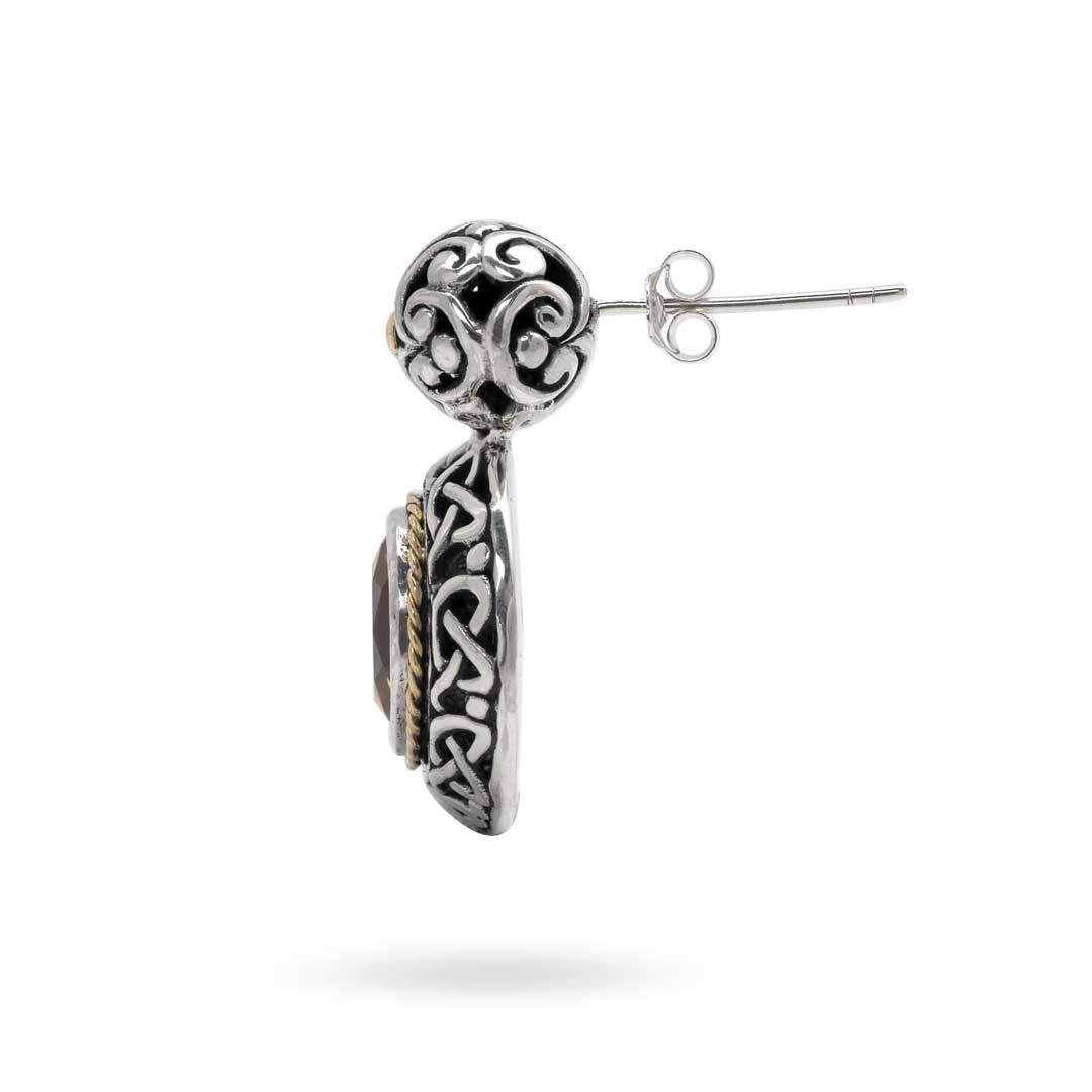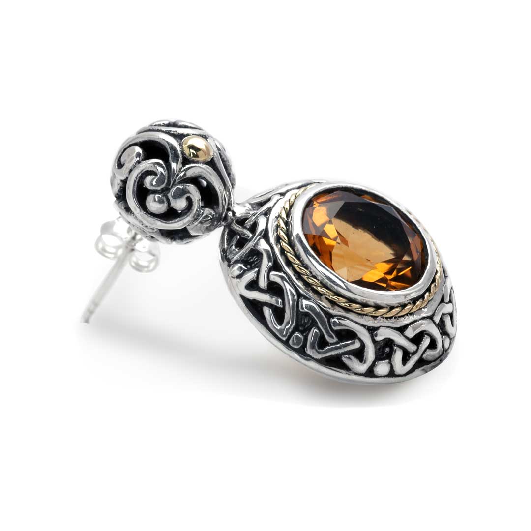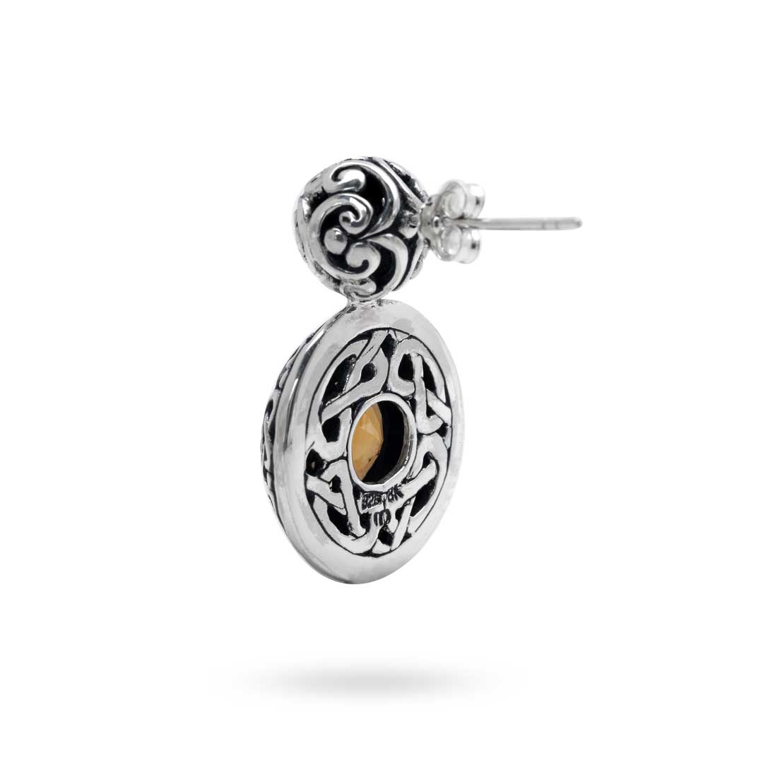 Boucle d'oreille en or et argent, motif celtique balinais, sertie de quartz citrine 10 mm