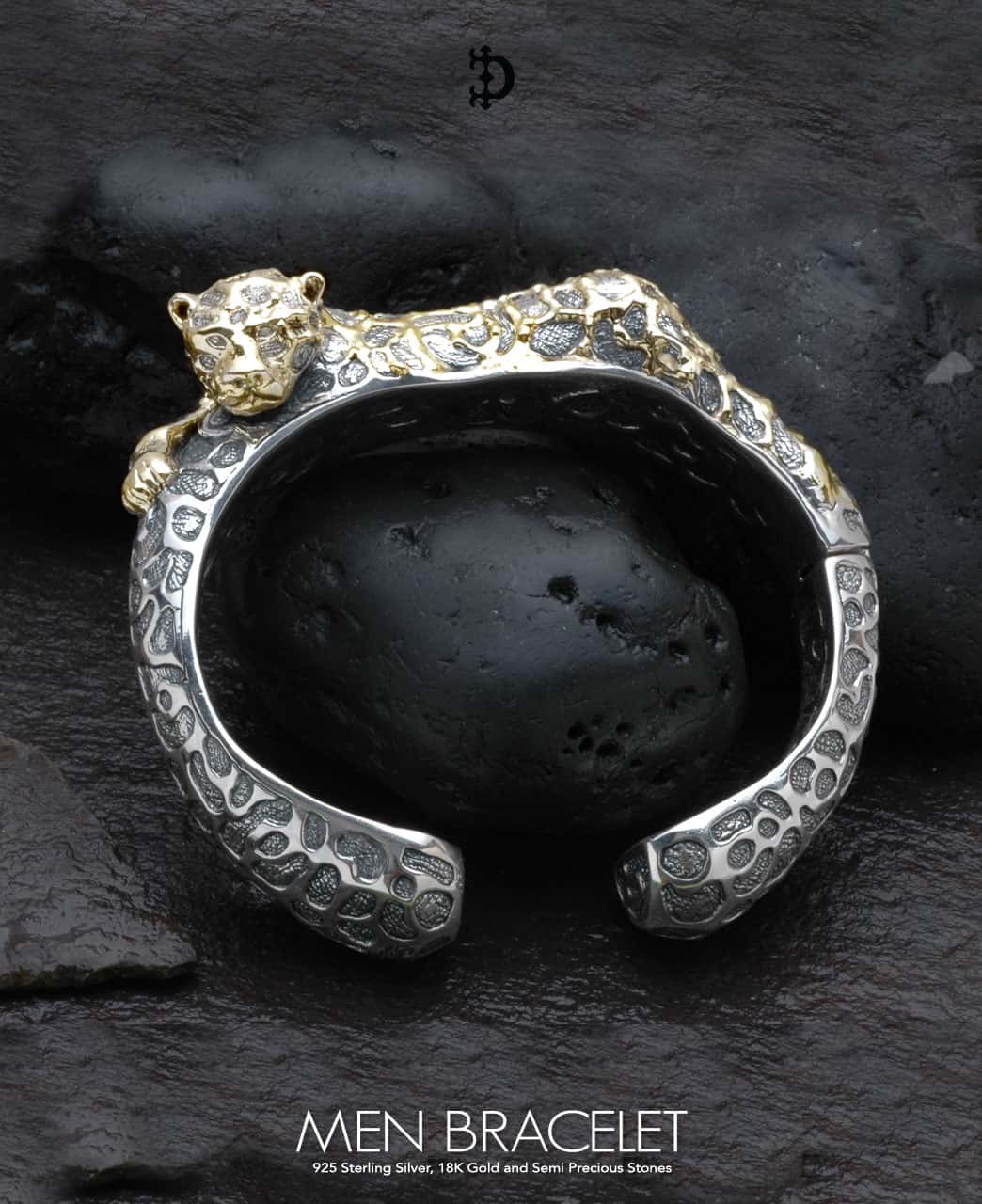 Gold & Silver leather bracelet, Lion head with sisik naga motif, Black Sapphire pave, black leather strap 11mm, spring lock