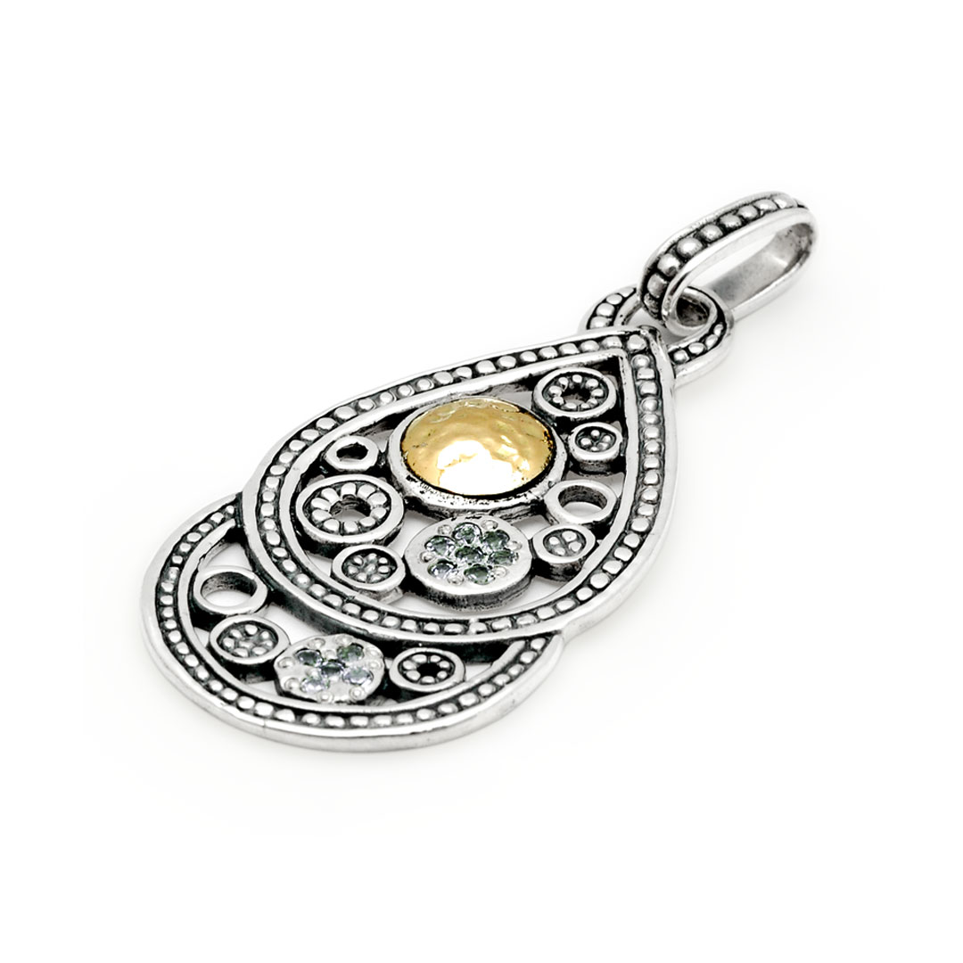 Silver and Gold pendant, circle and pear shape motif, with white topaz pave stones